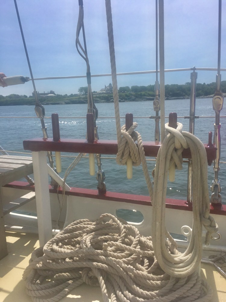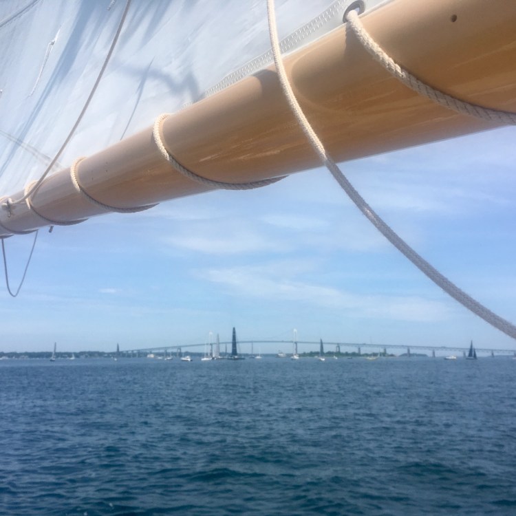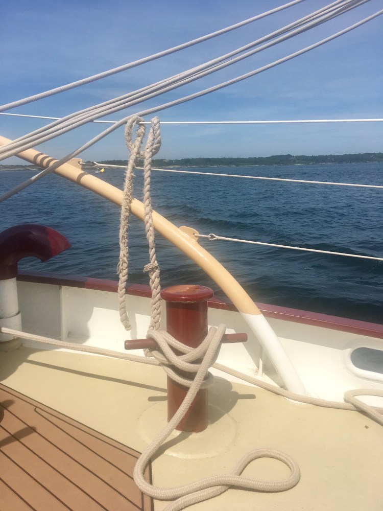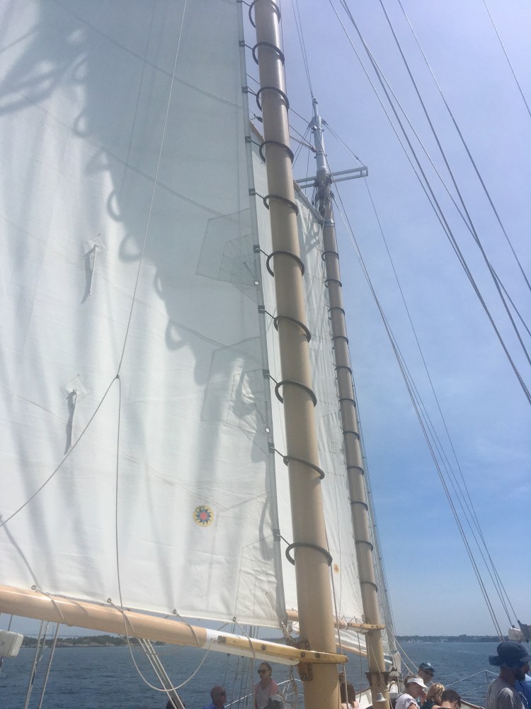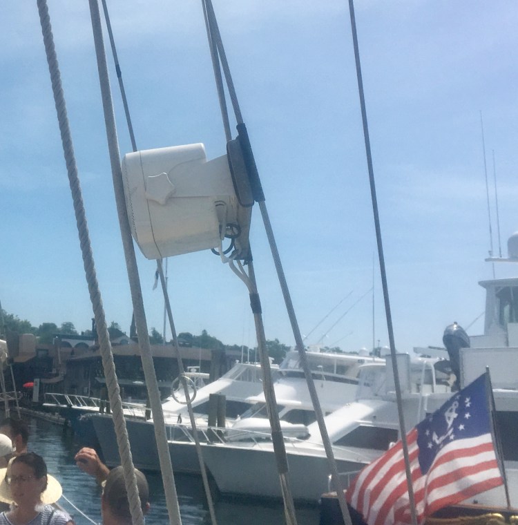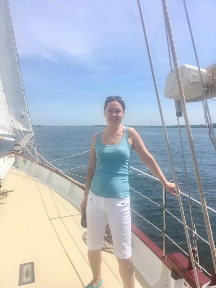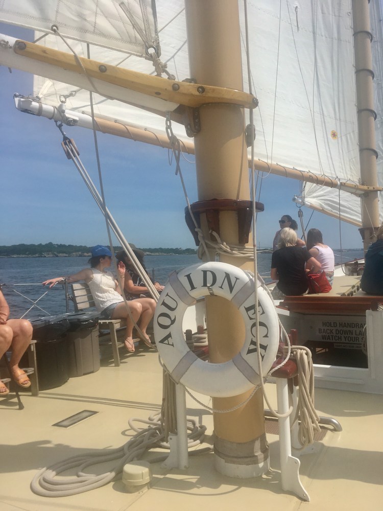Arrivée aux États-Unis par une belle journée chaude de juillet à Newport dans l’Etat de Rhode Island, mon amoureux et moi avons déambulé dans le port, Bowen’s wharf. Nous nous sommes arrêtés à ce kiosque qui proposait des tours en bateaux. Nous avons choisis celui du lendemain matin pour quelques heures de balade en mer sur un voilier. Ce serait ma première fois. Waouh!