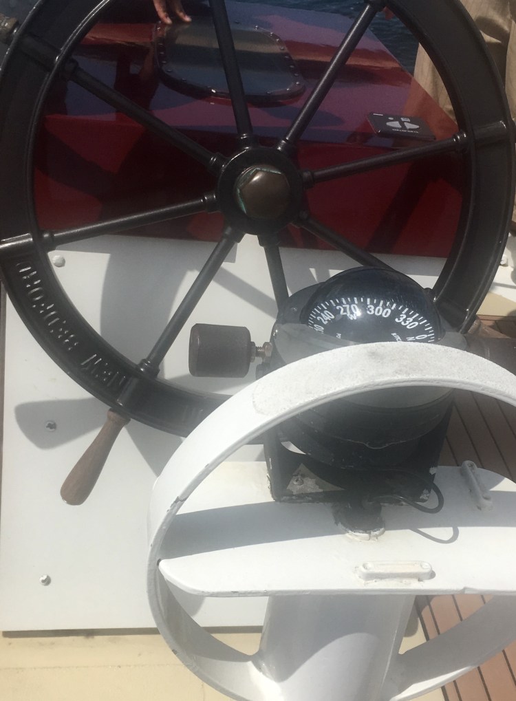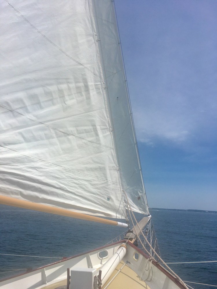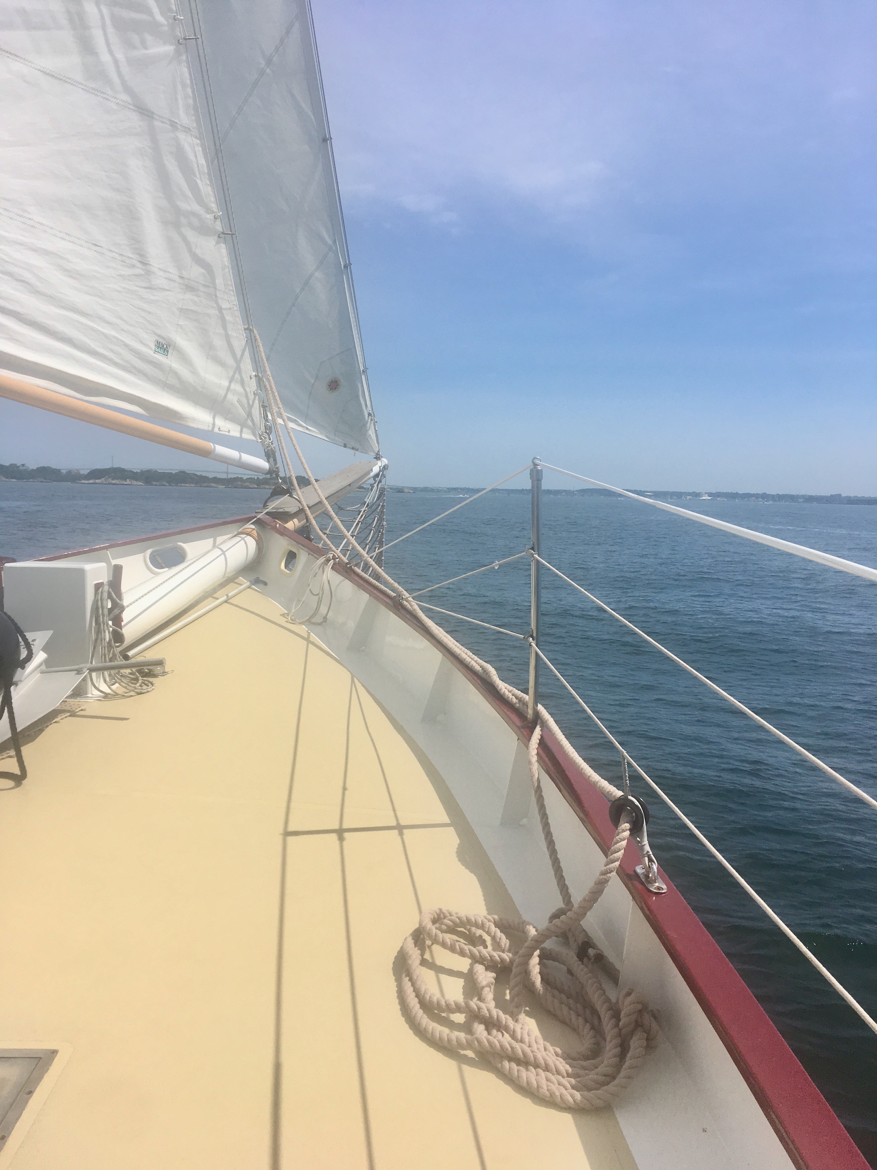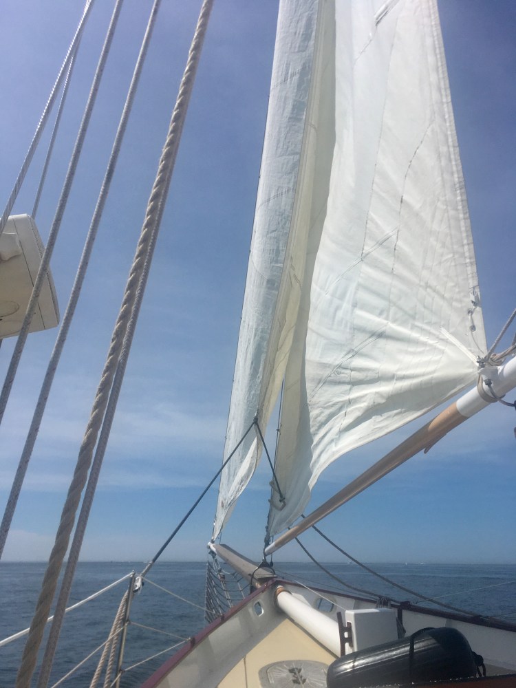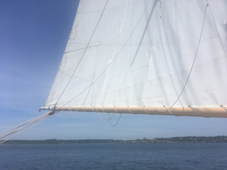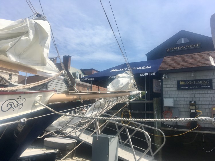 Arrivée aux États-Unis par une belle journée chaude de juillet à Newport dans l’Etat de Rhode Island, mon amoureux et moi avons déambulé dans le port, Bowen’s wharf. Nous nous sommes arrêtés à ce kiosque qui proposait des tours en bateaux. Nous avons choisis celui du lendemain matin pour quelques heures de balade en mer sur un voilier. Ce serait ma première fois. Waouh!