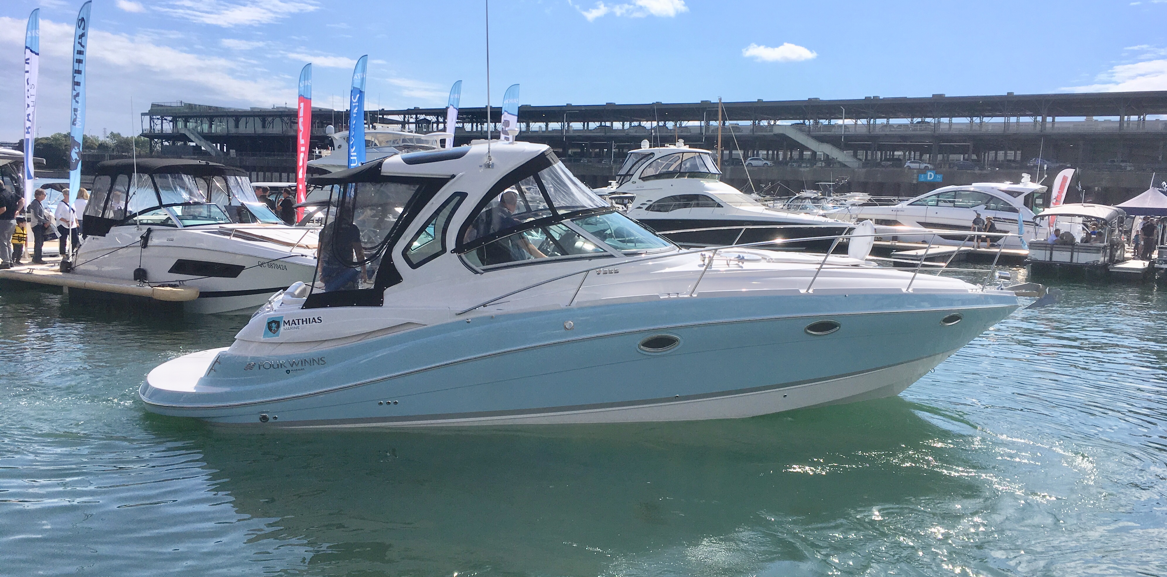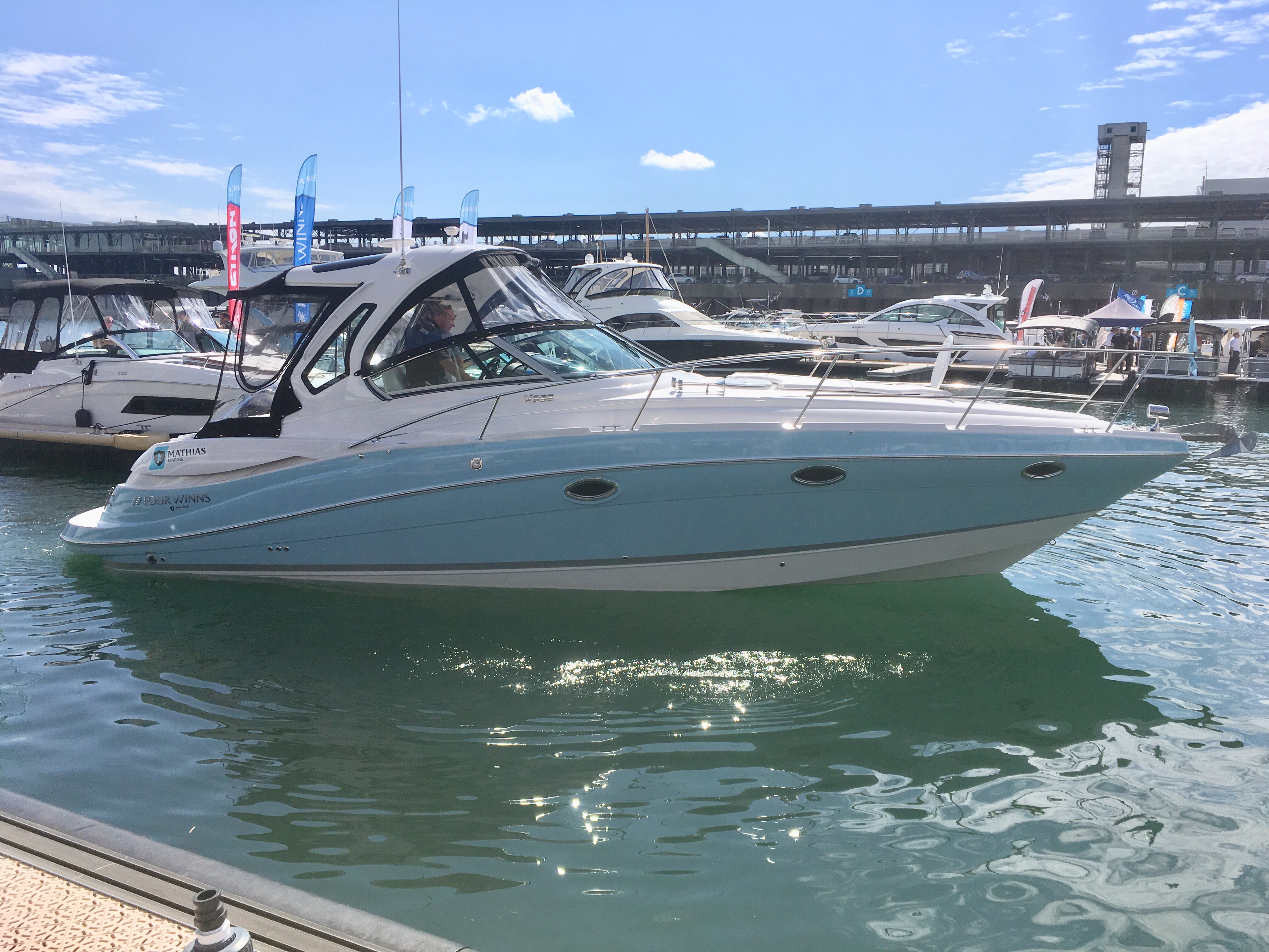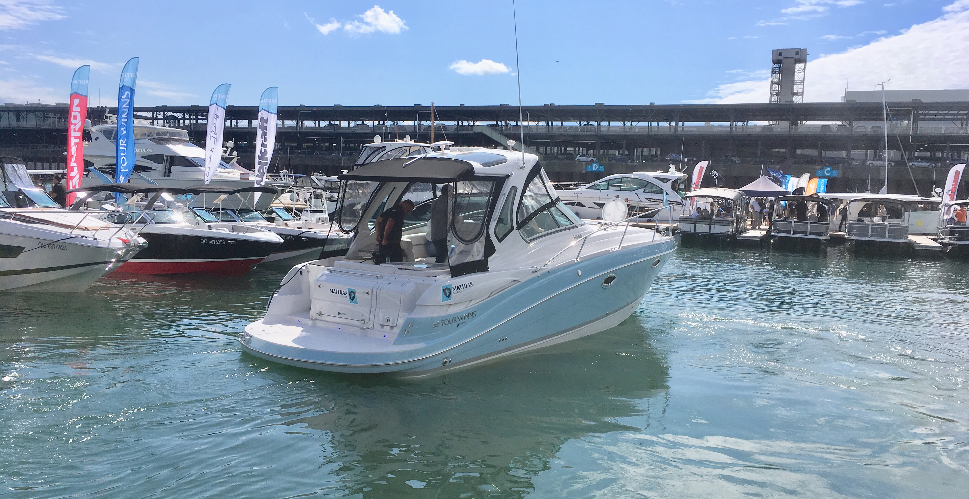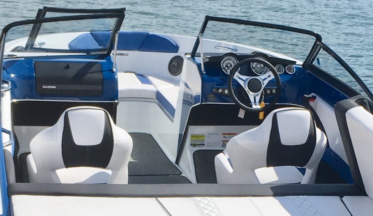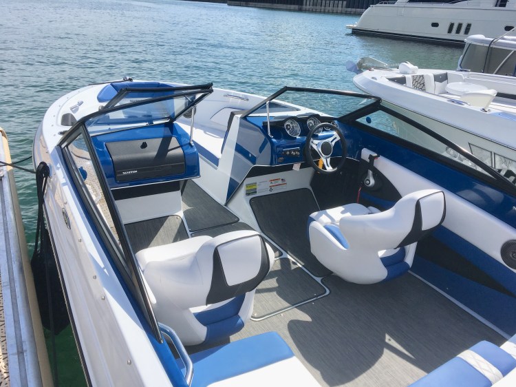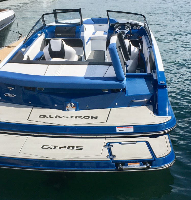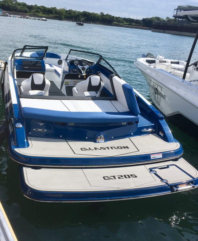 Un bateau d’un bleu des mers des caraïbes est en démonstration sur le fleuve St-Laurent.
