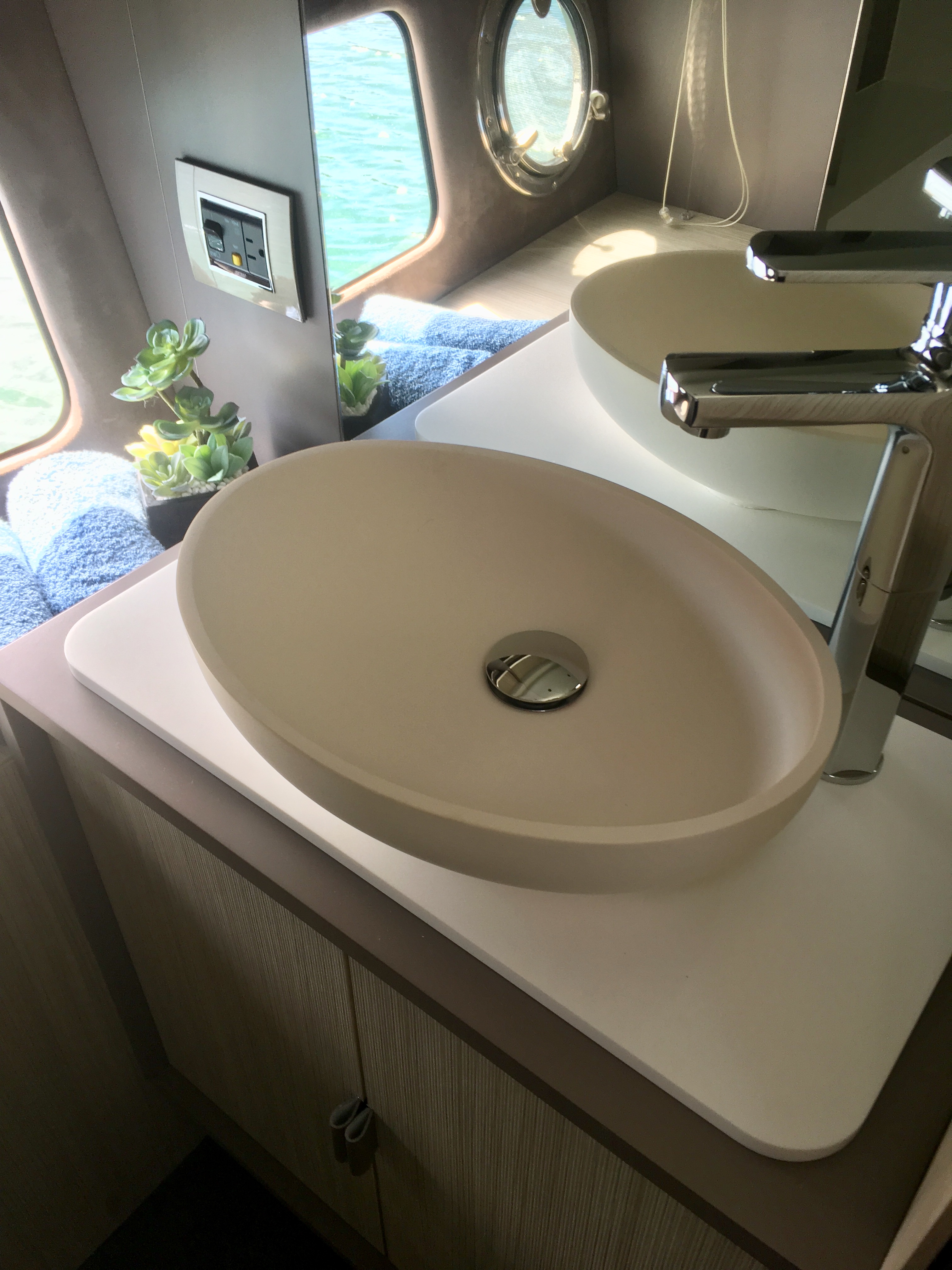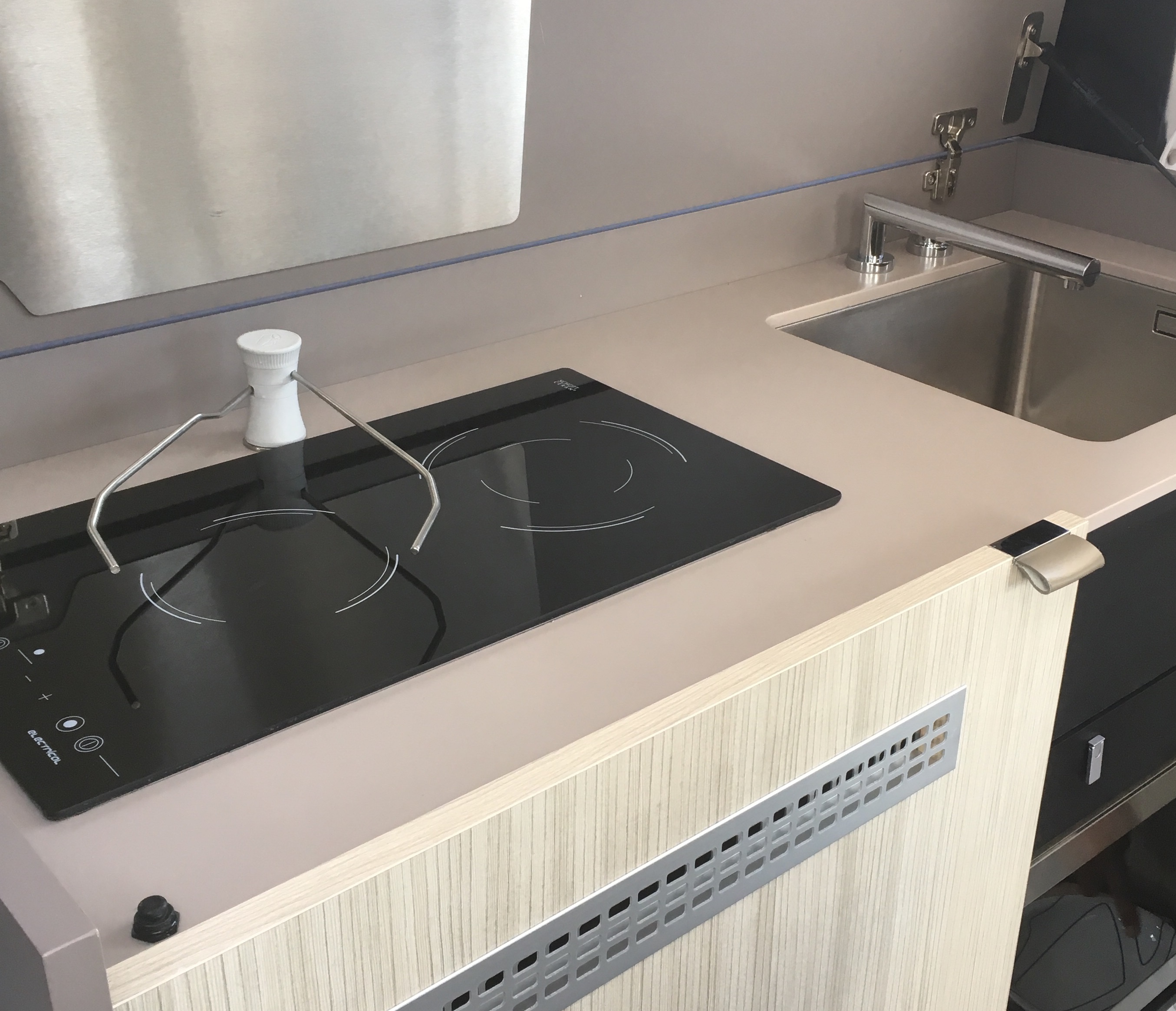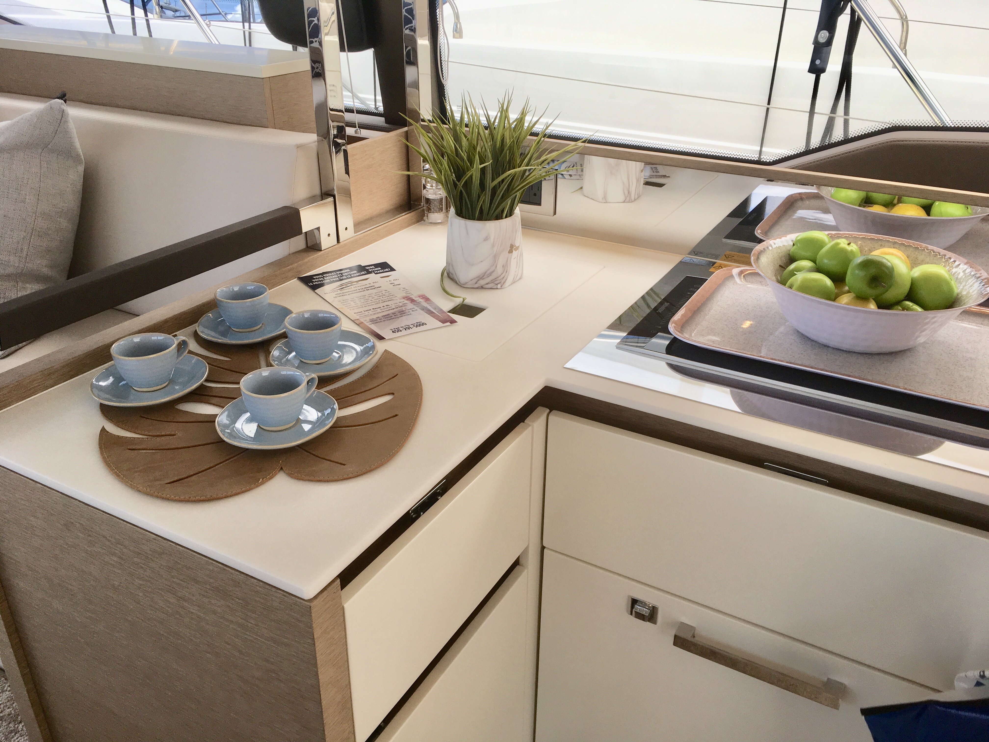 Tout est organisé dans la cuisine et la salle de bain pour naviguer sur l’eau avec le mouvement des vagues. Les verres sont rangés dans un moule en plastique dans l’armoire. Lors de la cuisson, les casseroles ou les poêles sont retenues par deux barres en métal.
