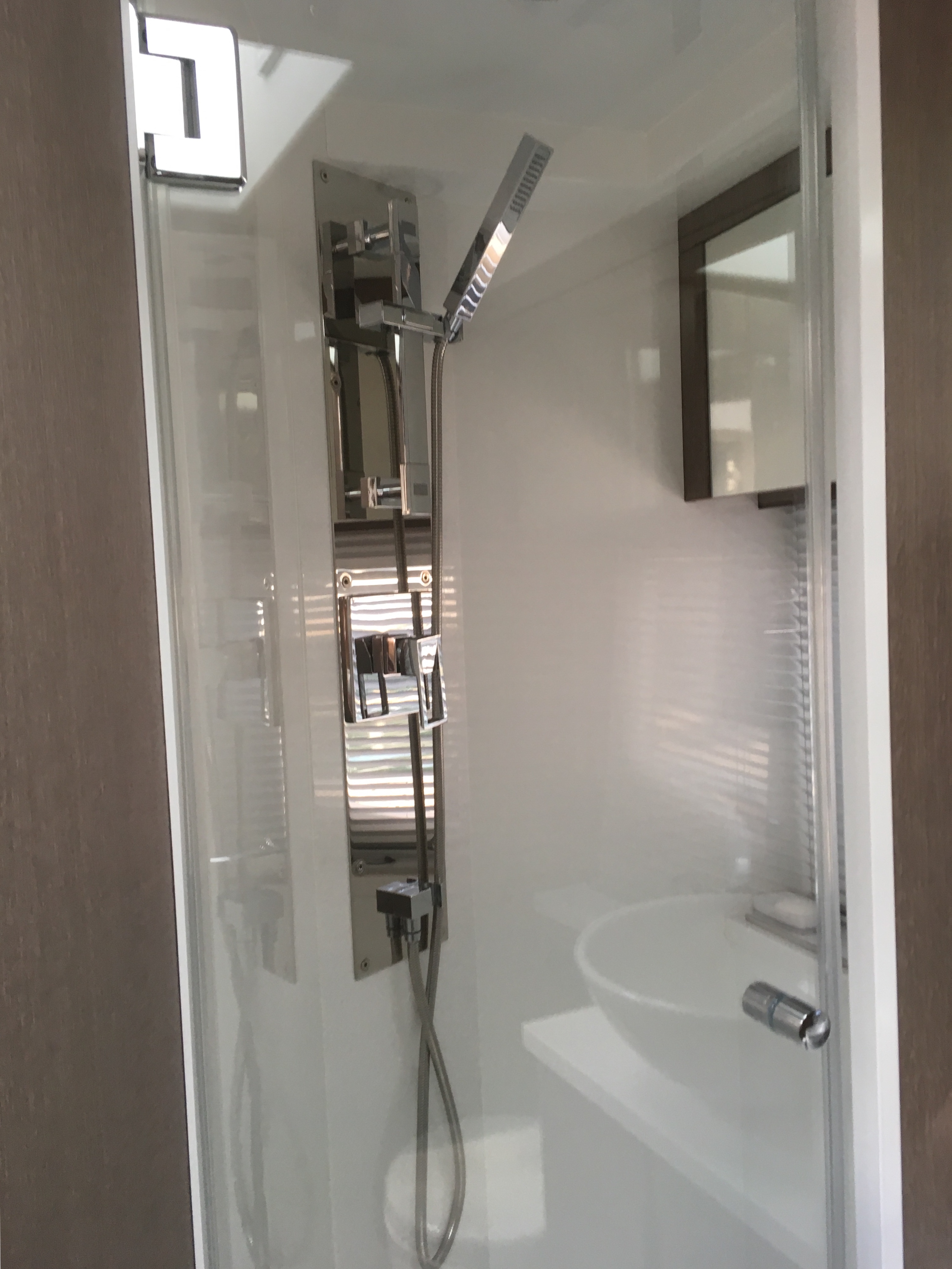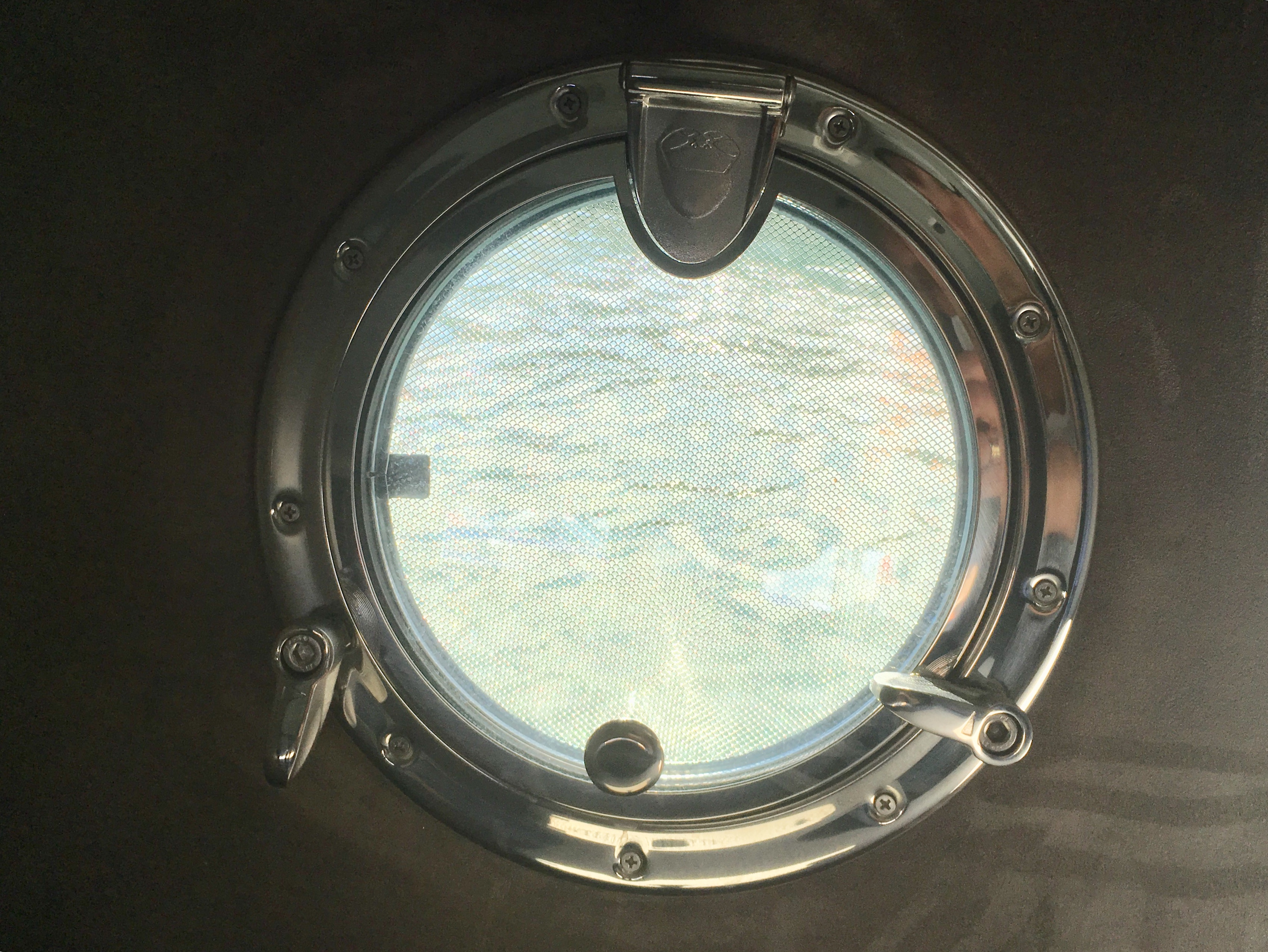 La salle de bain est lumineuse avec une double vue sur l’eau dont un hublot qui peut s’ouvrir pour aérer la pièce à quai.