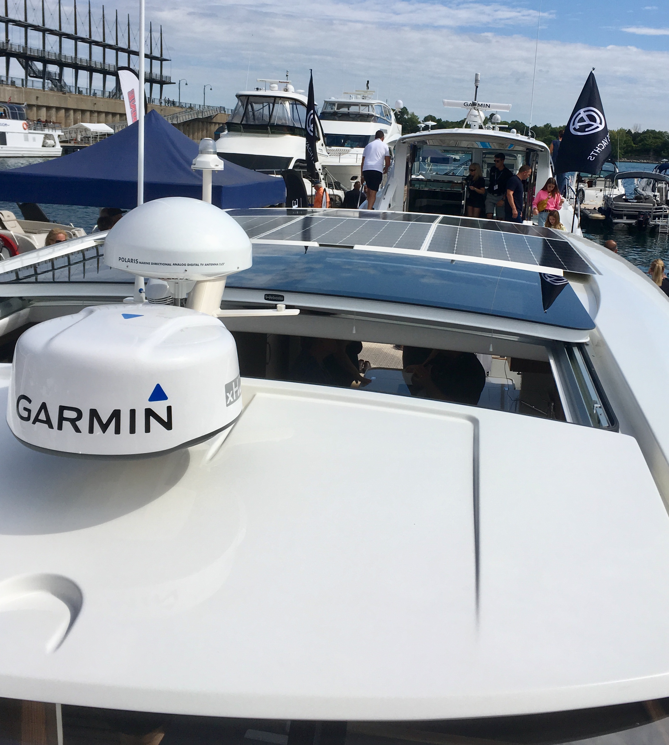 Un bateau avec un toit solaire et un moteur hybride (voir ci-dessous). A bord, de l’alimentation 110 et 220 volts en tout temps!