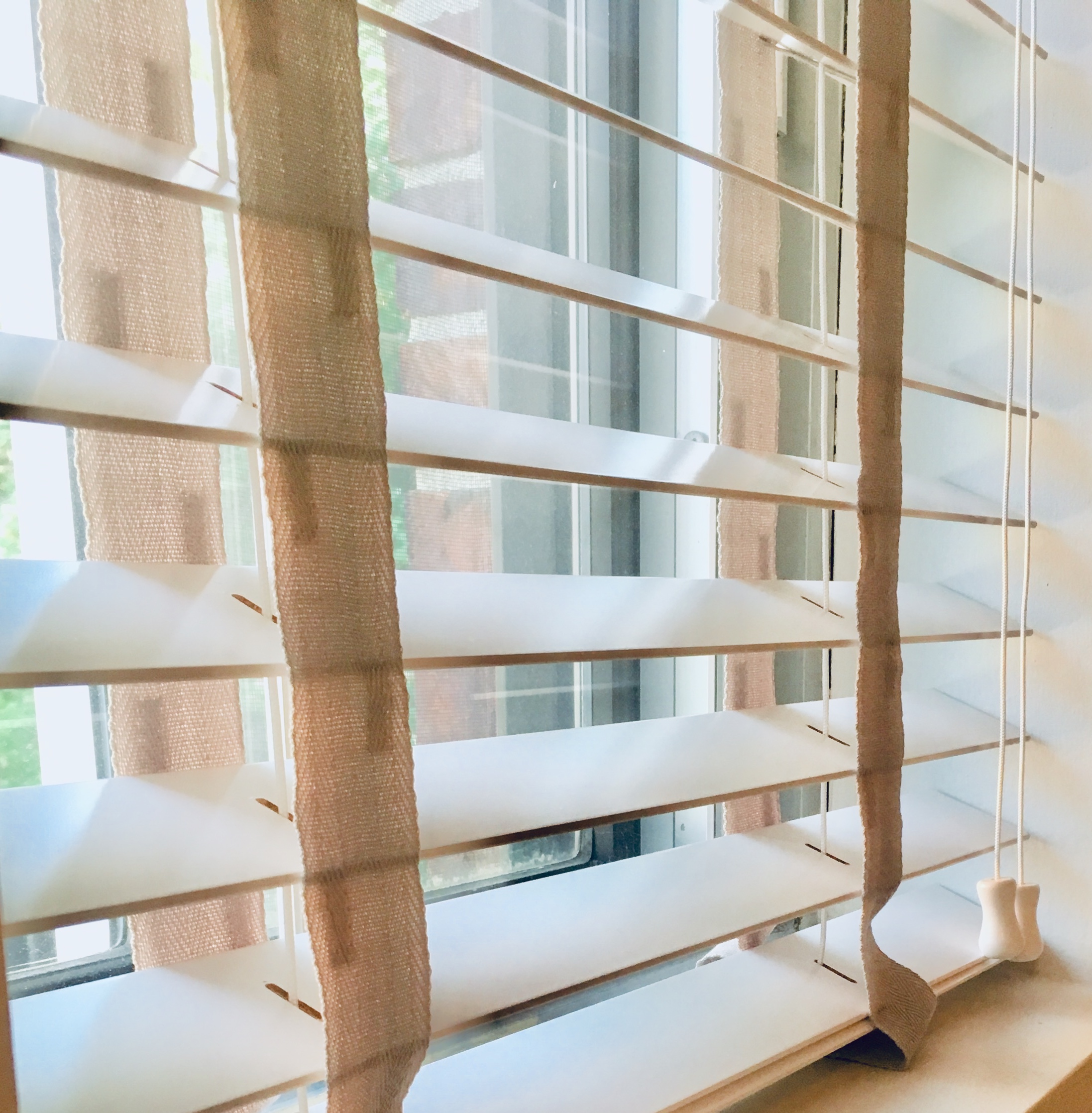 Mes stores sont en bois blanc avec un ruban gris pour rappeler les couleur du mur, le gris, et des contre-marches, le blanc.