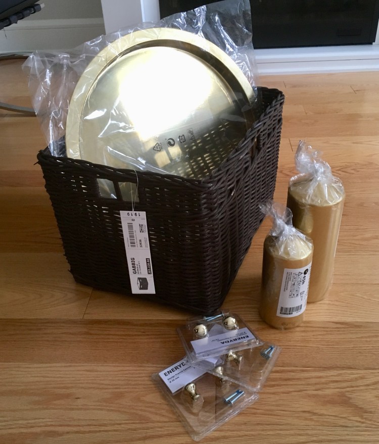 Voilà mes achats lors de ma dernière visite: des poignées de meubles dorées, des bougies dorées, un plateau doré et un panier d’osier marron.