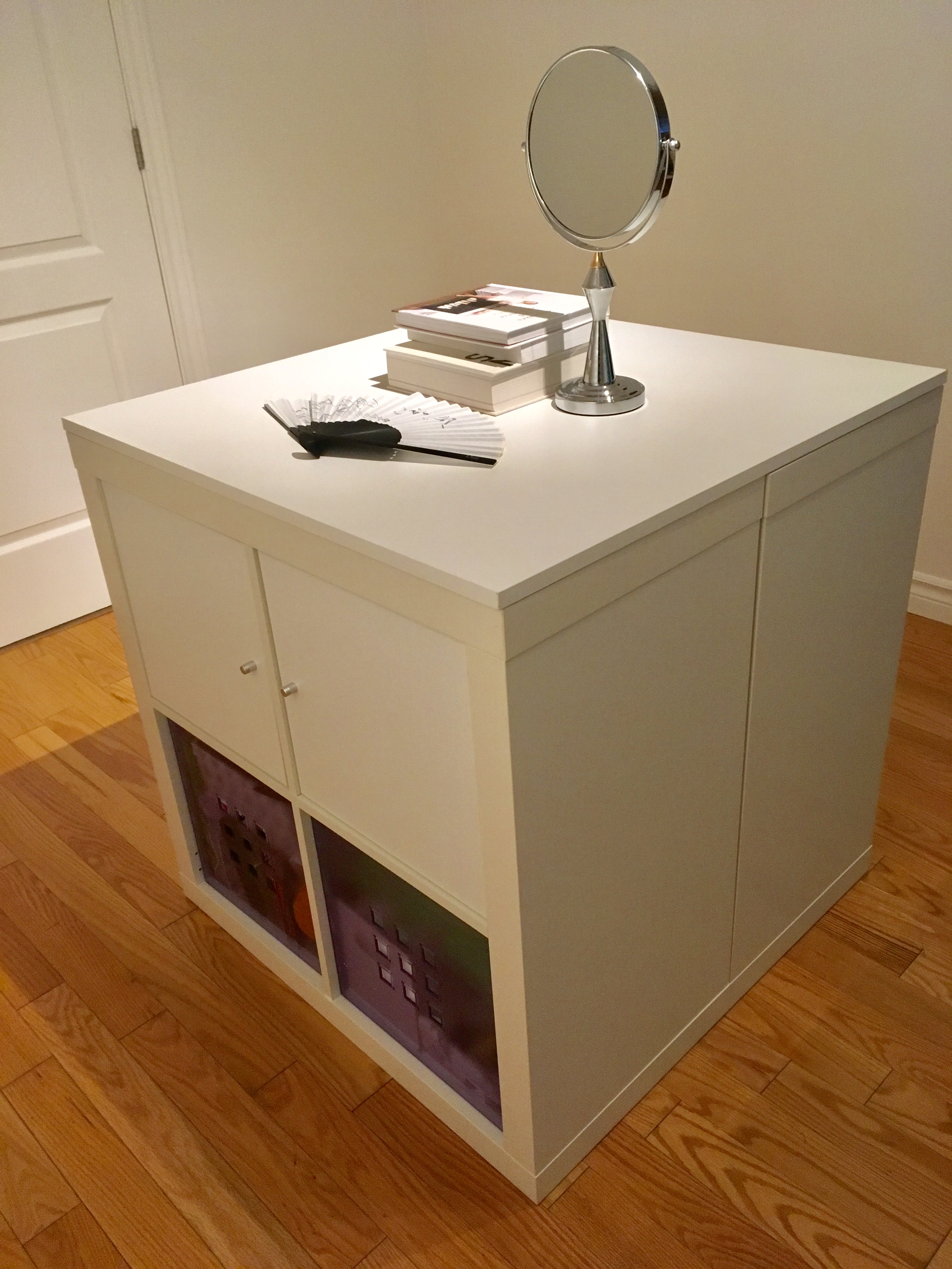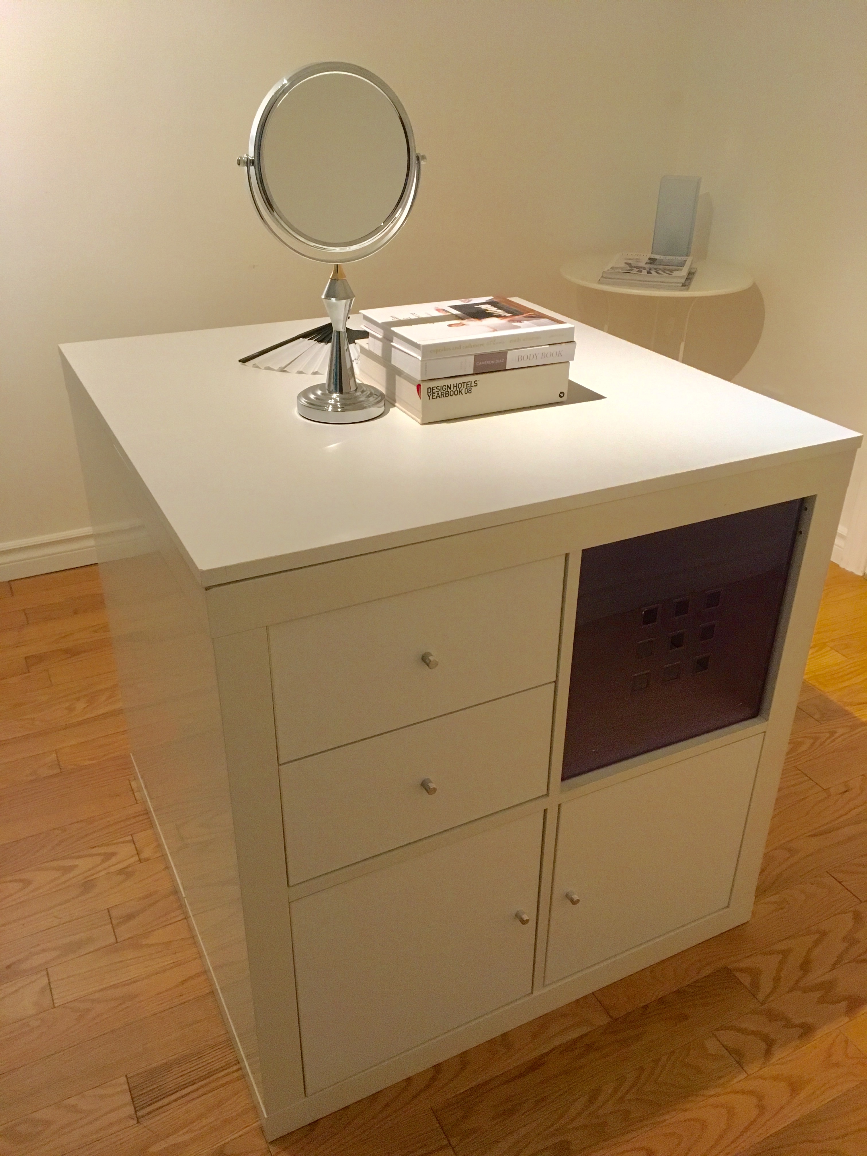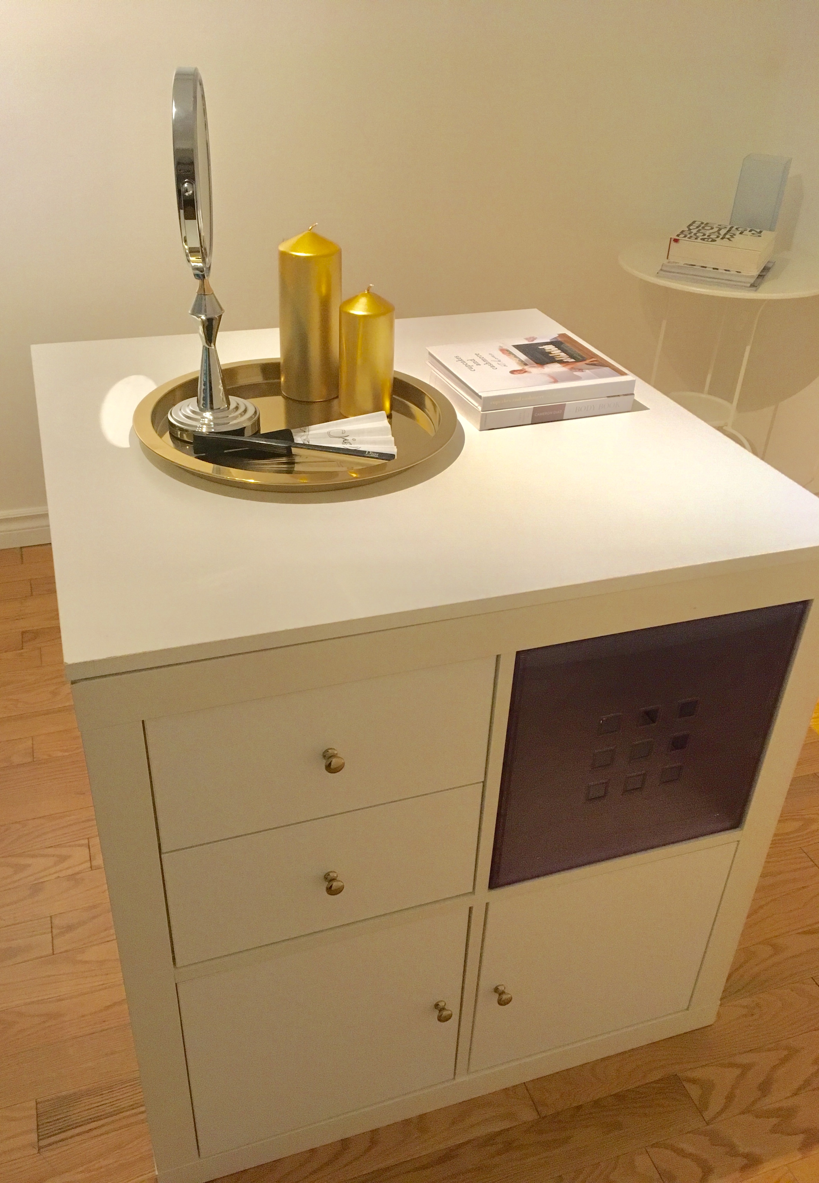 Les autres accessoires ont transformés un ancien meuble Ikea en version plus chic et glamour avec le doré des boutons de tiroirs, du plateau et des bougies! Des cadres dorés accrochés au mur avaient été acheté précédemment.