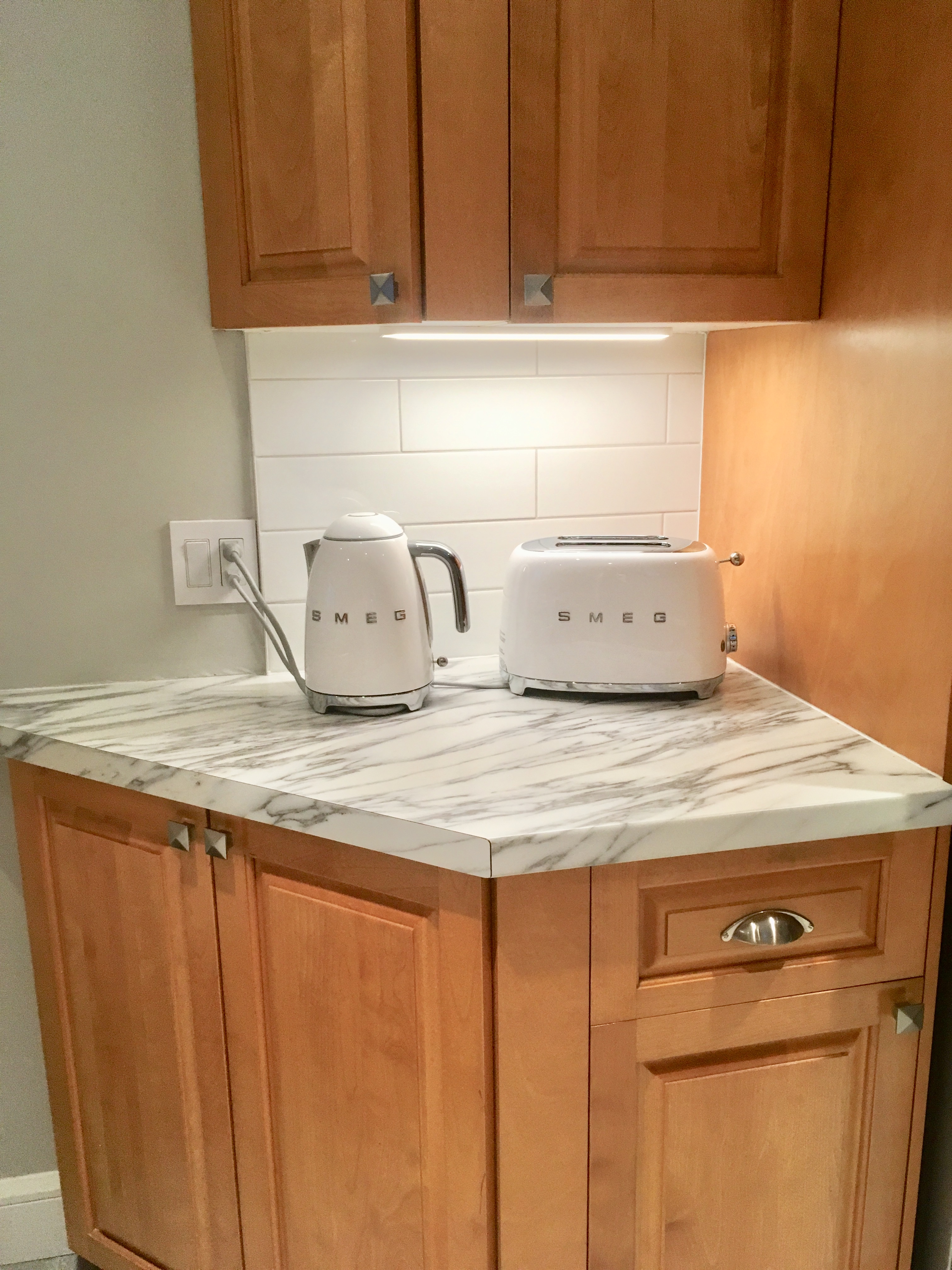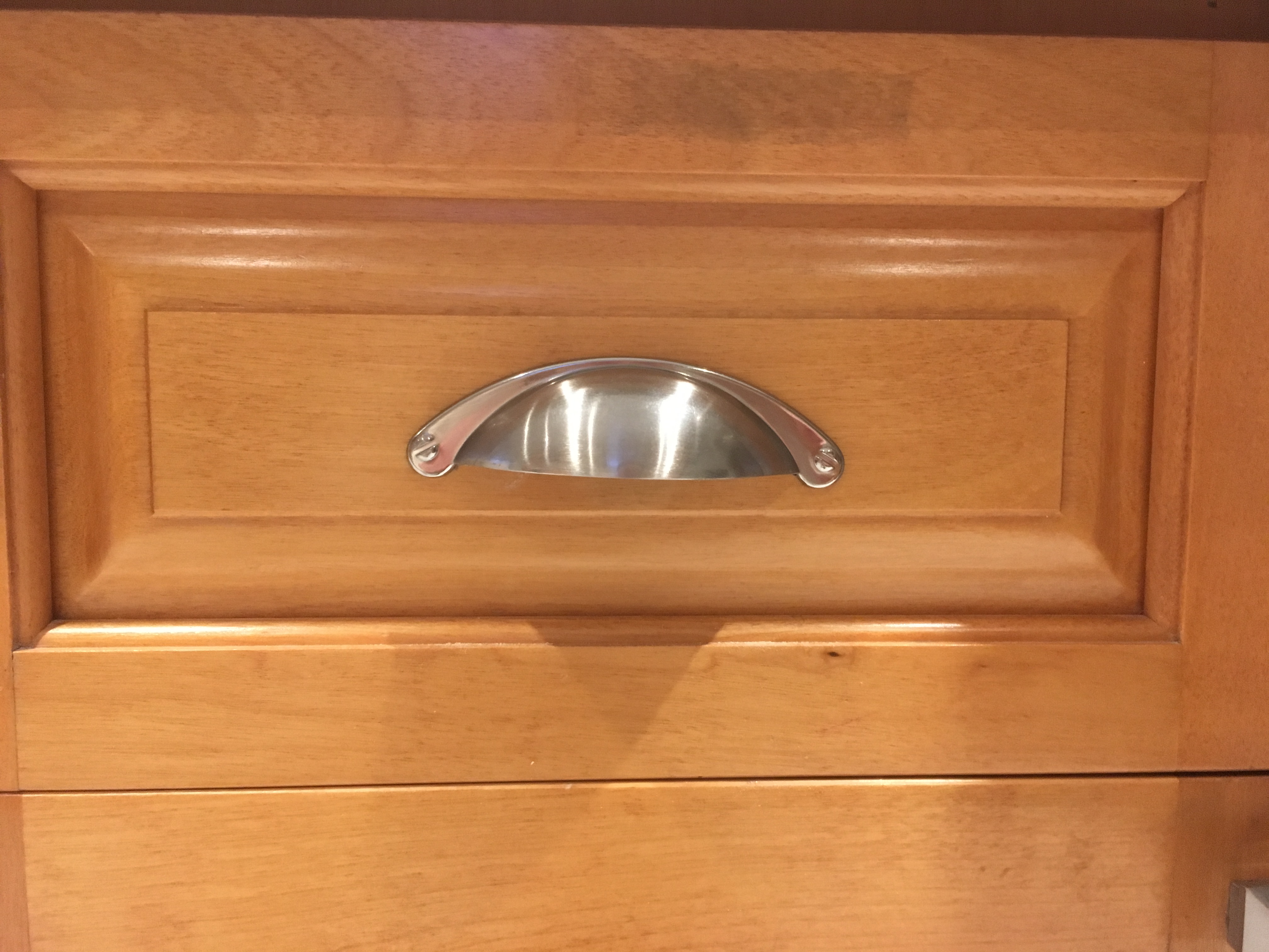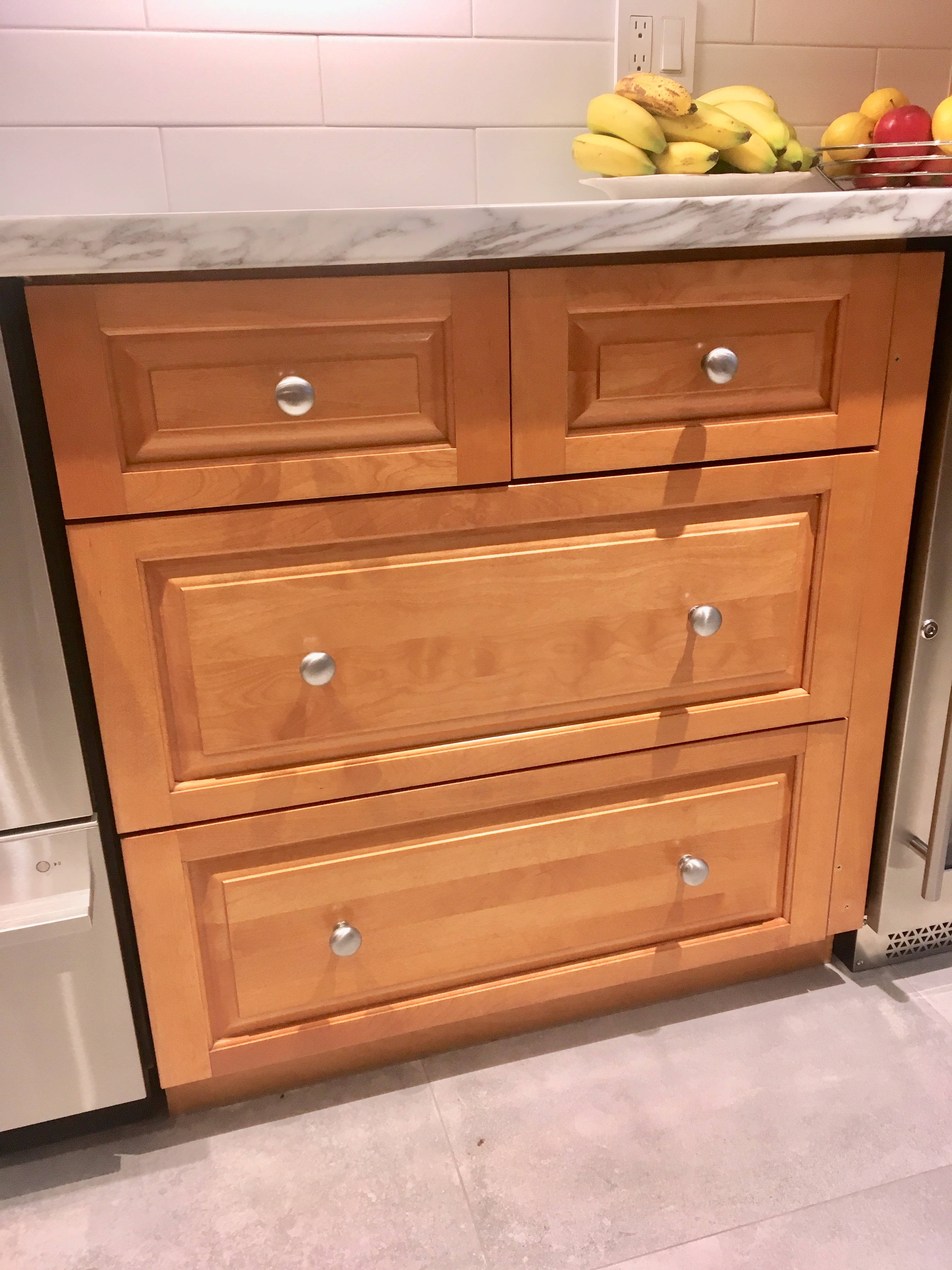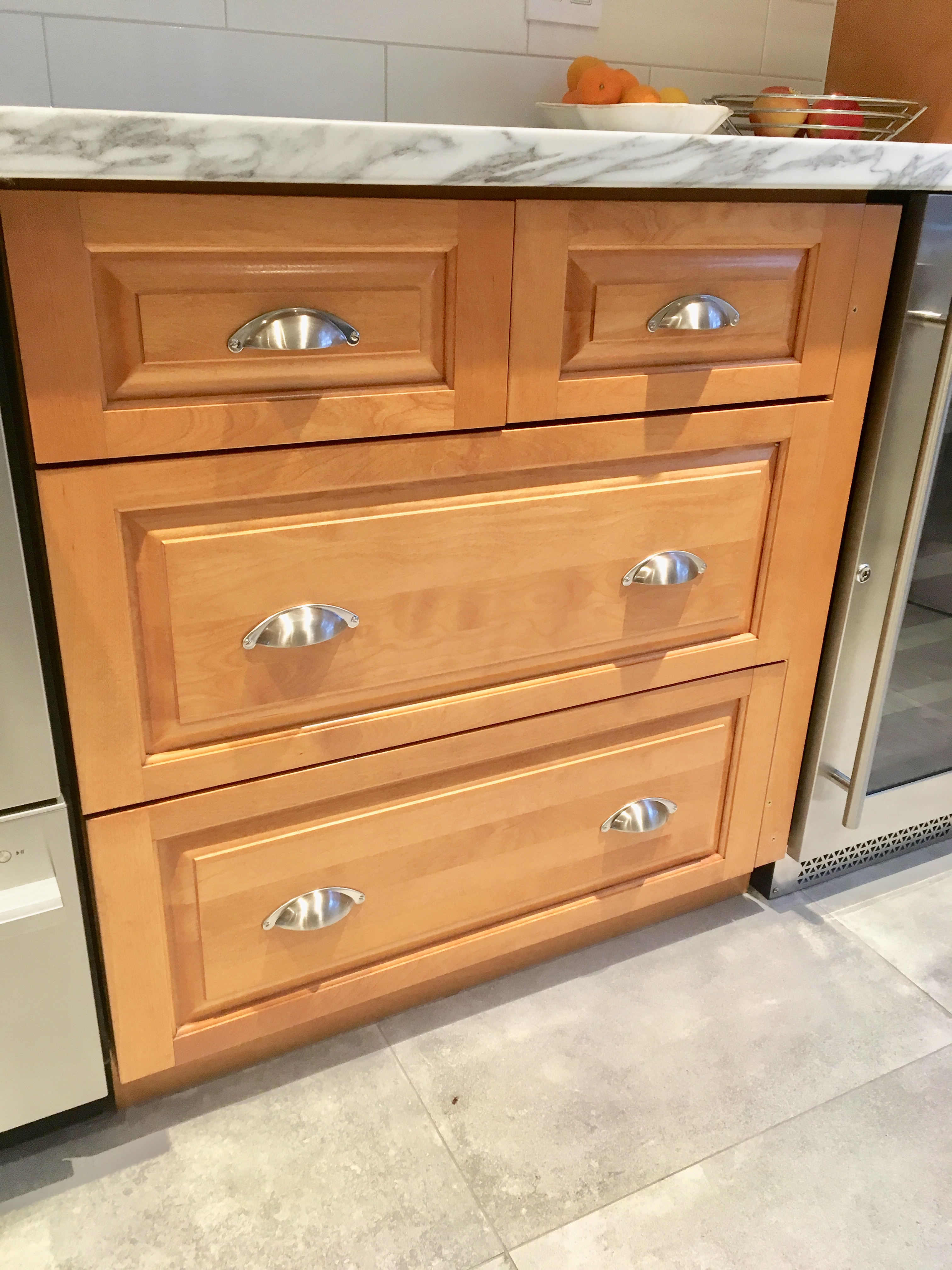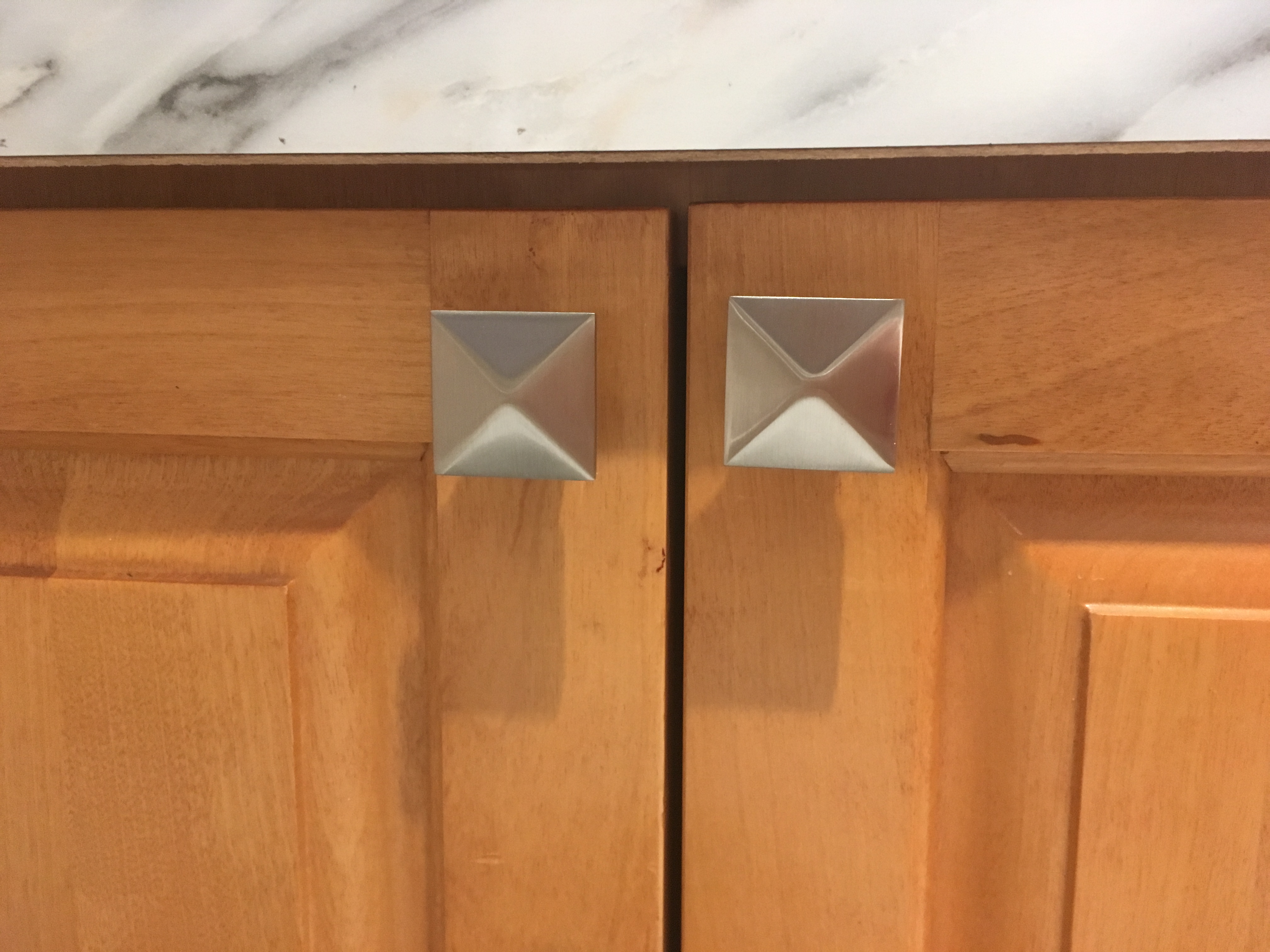 Les boutons arrondis ont été remplacés par des boutons carrés à relief et une forme différente a été choisie pour les tiroirs. Le style des placards est plus chic et original!