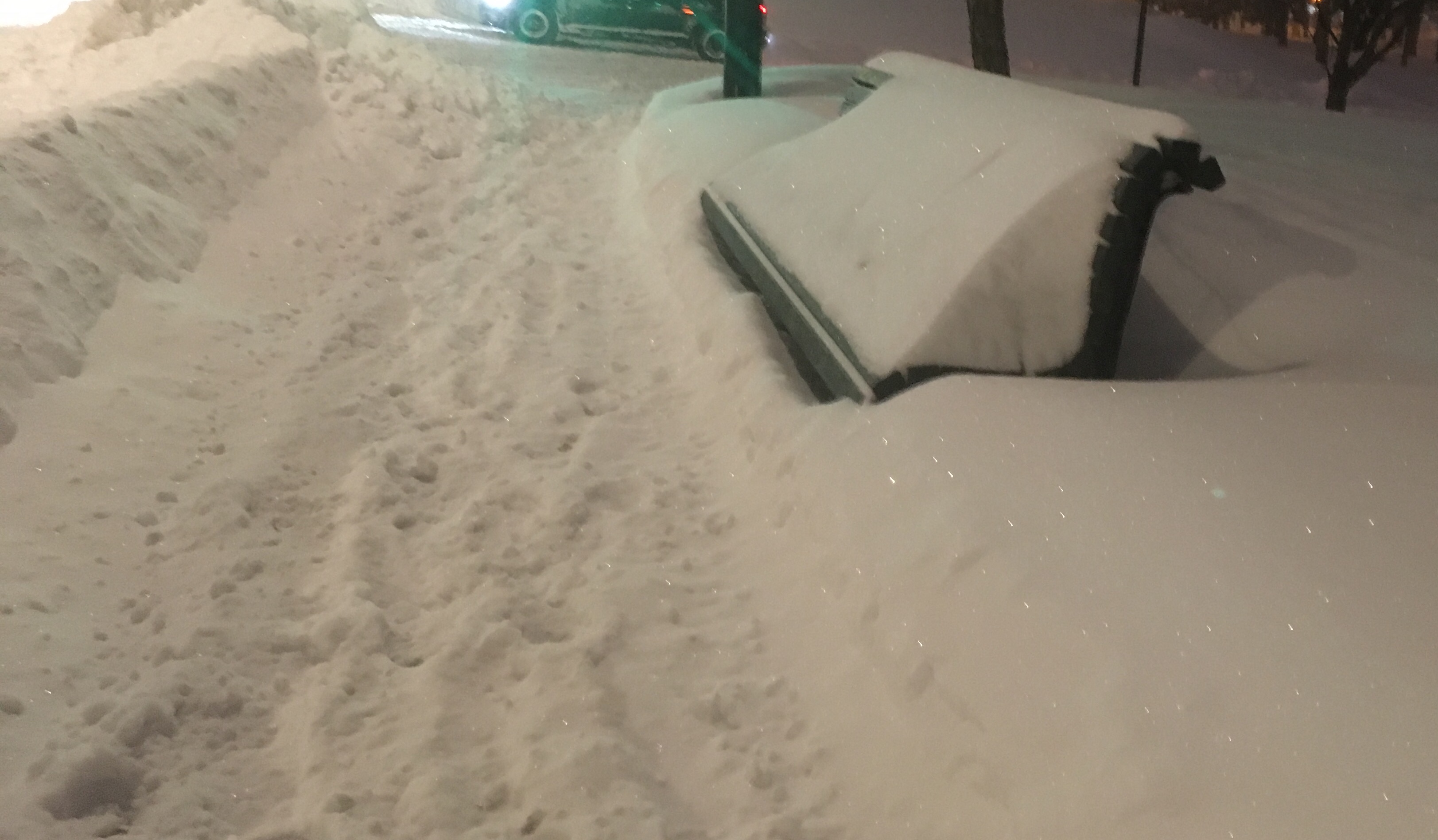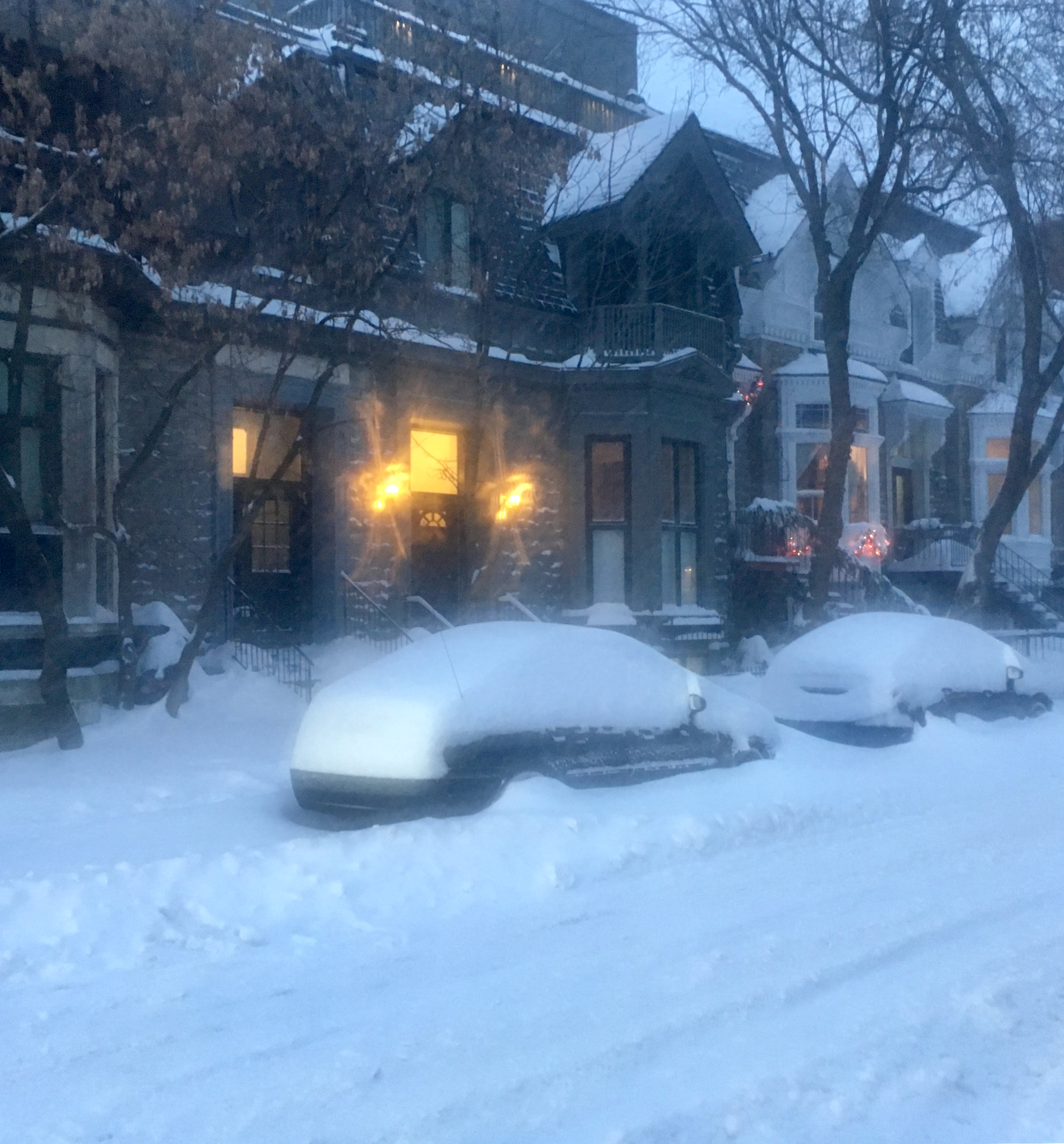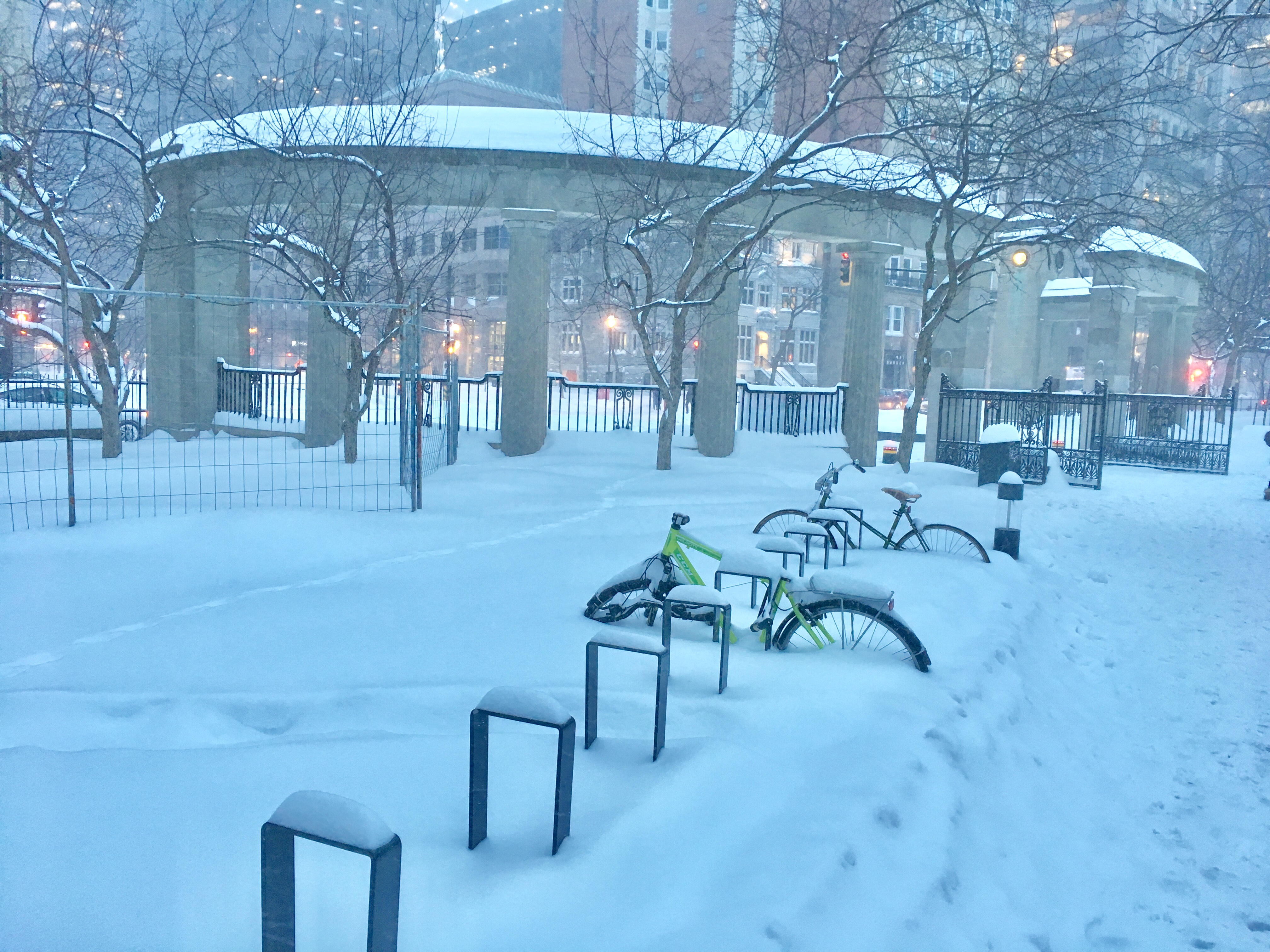 En début de soirée, les bancs, les escaliers, les trottoirs sont recouverts d’une épaisse couche de neige; la neige est tombée toute la journée.