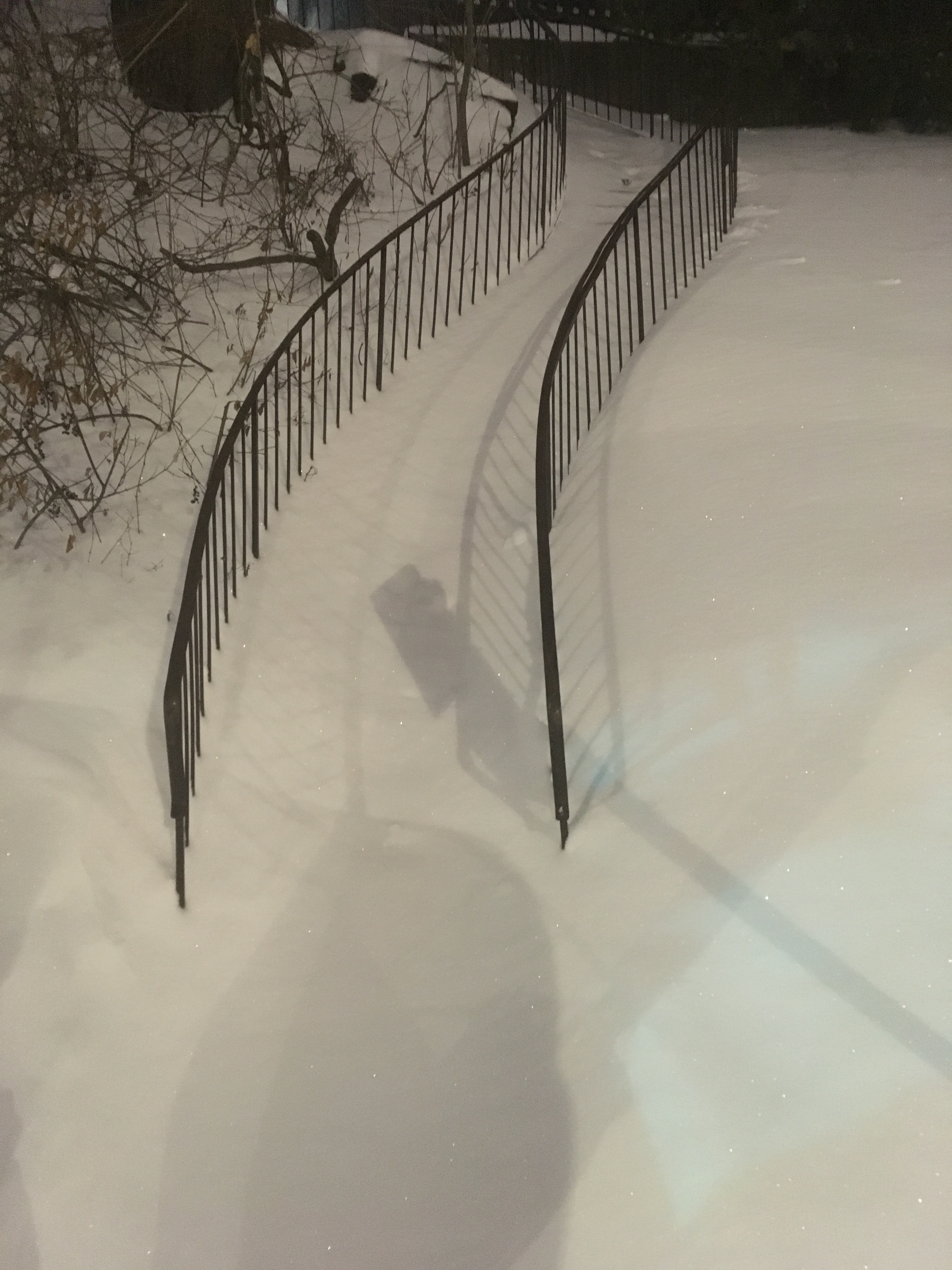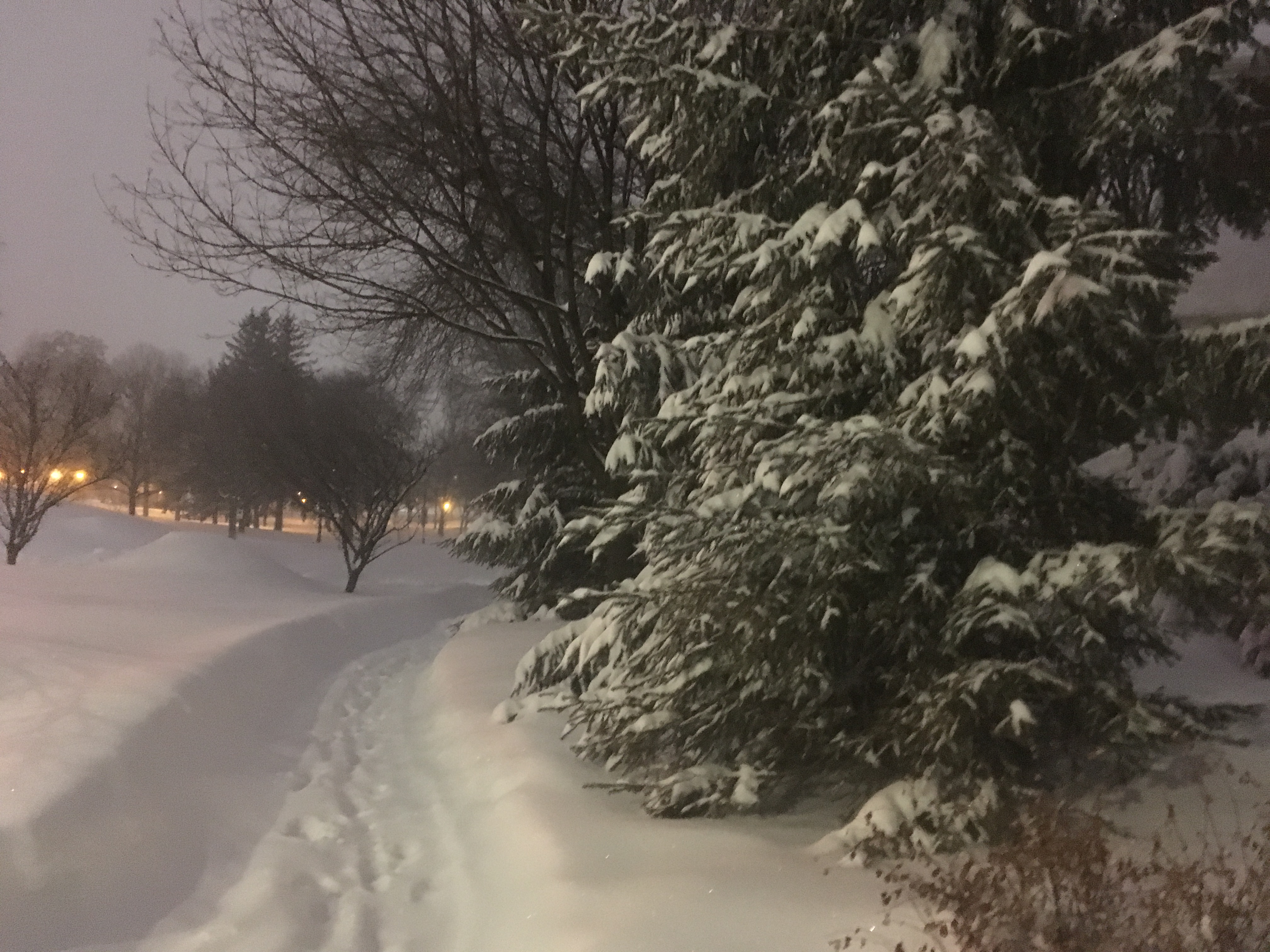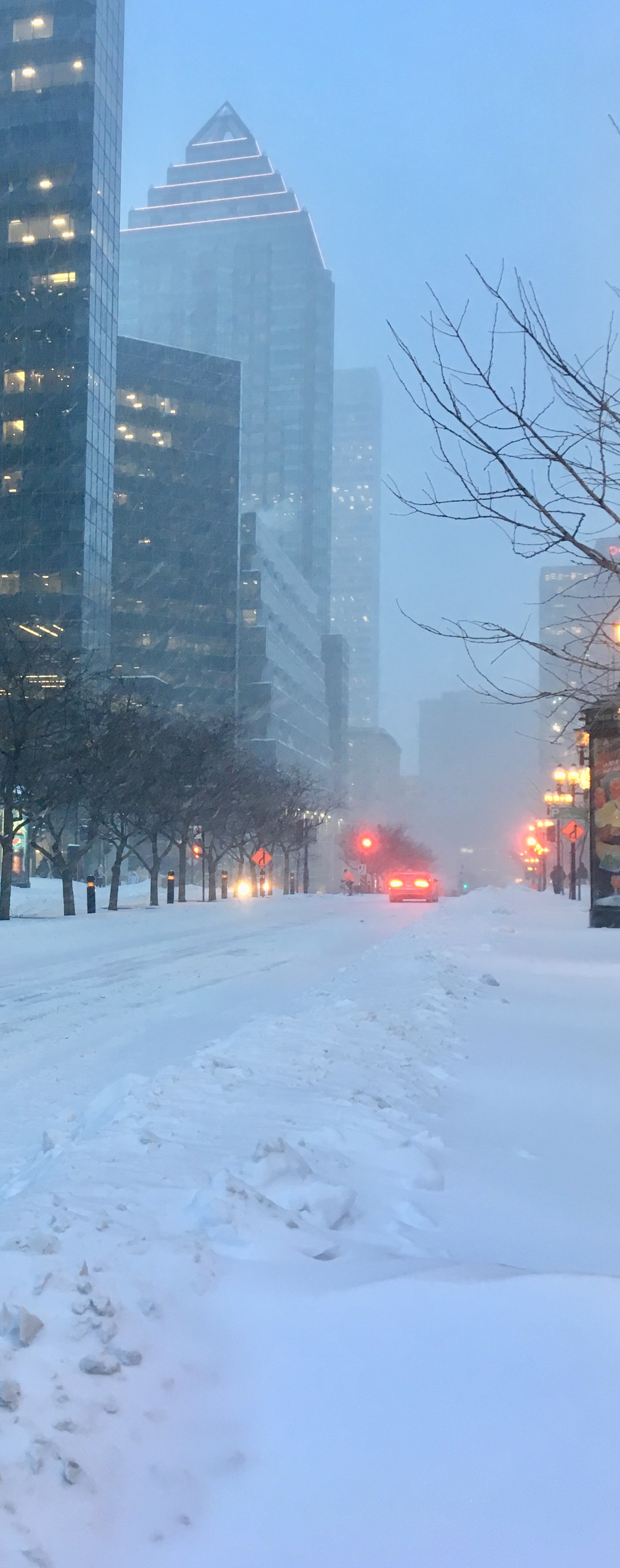 En début de soirée, les bancs, les escaliers, les trottoirs sont recouverts d’une épaisse couche de neige; la neige est tombée toute la journée.