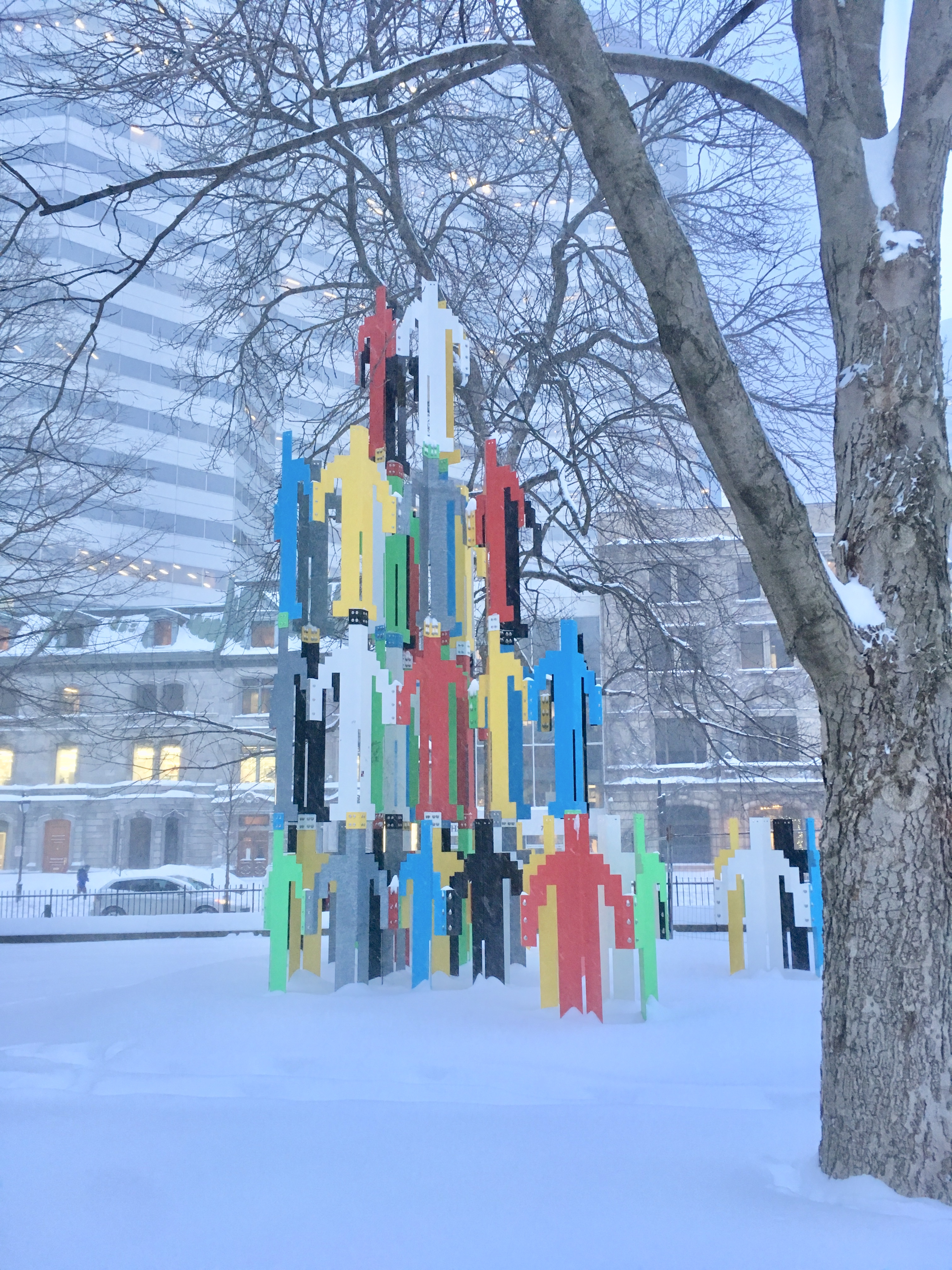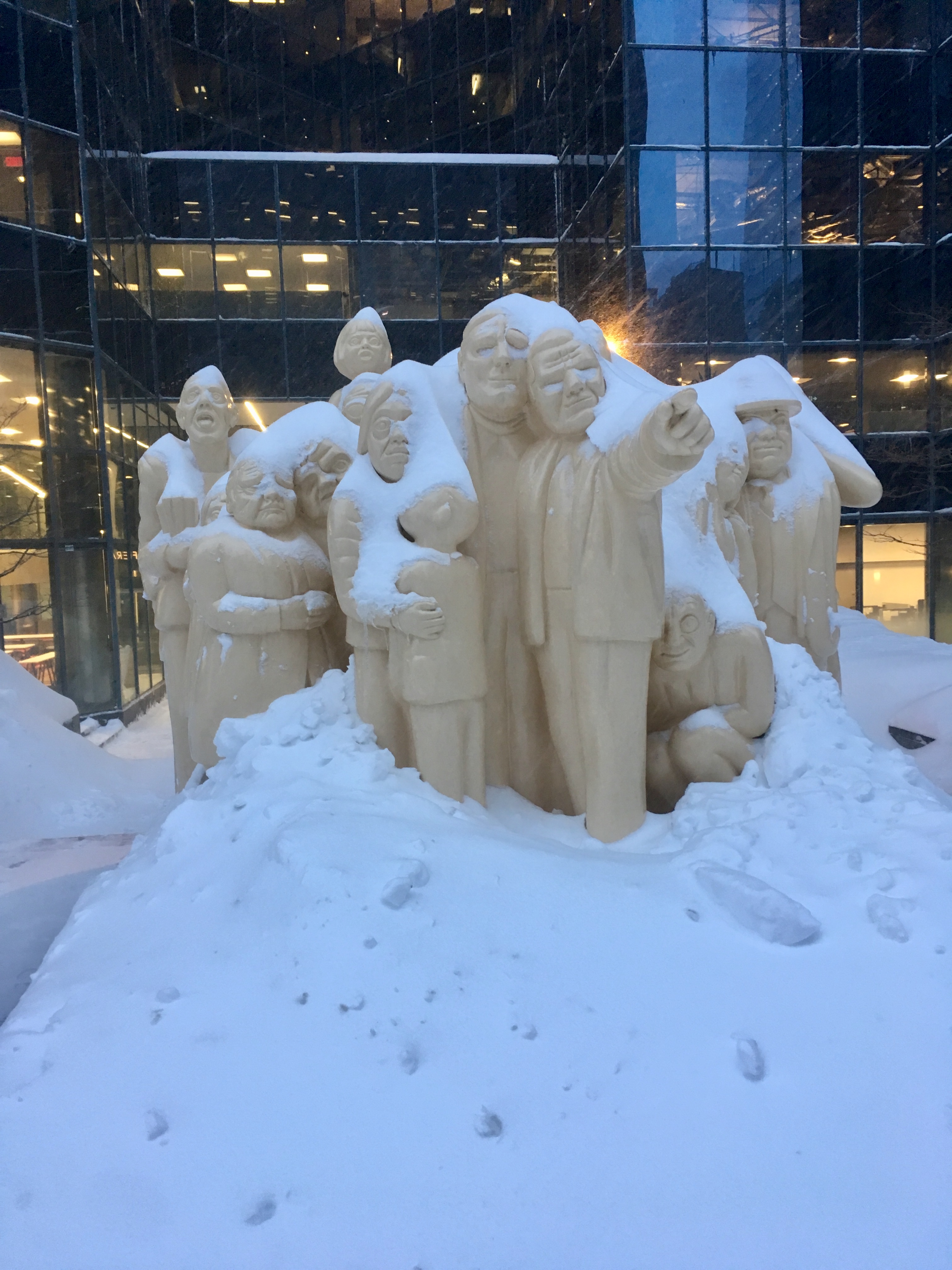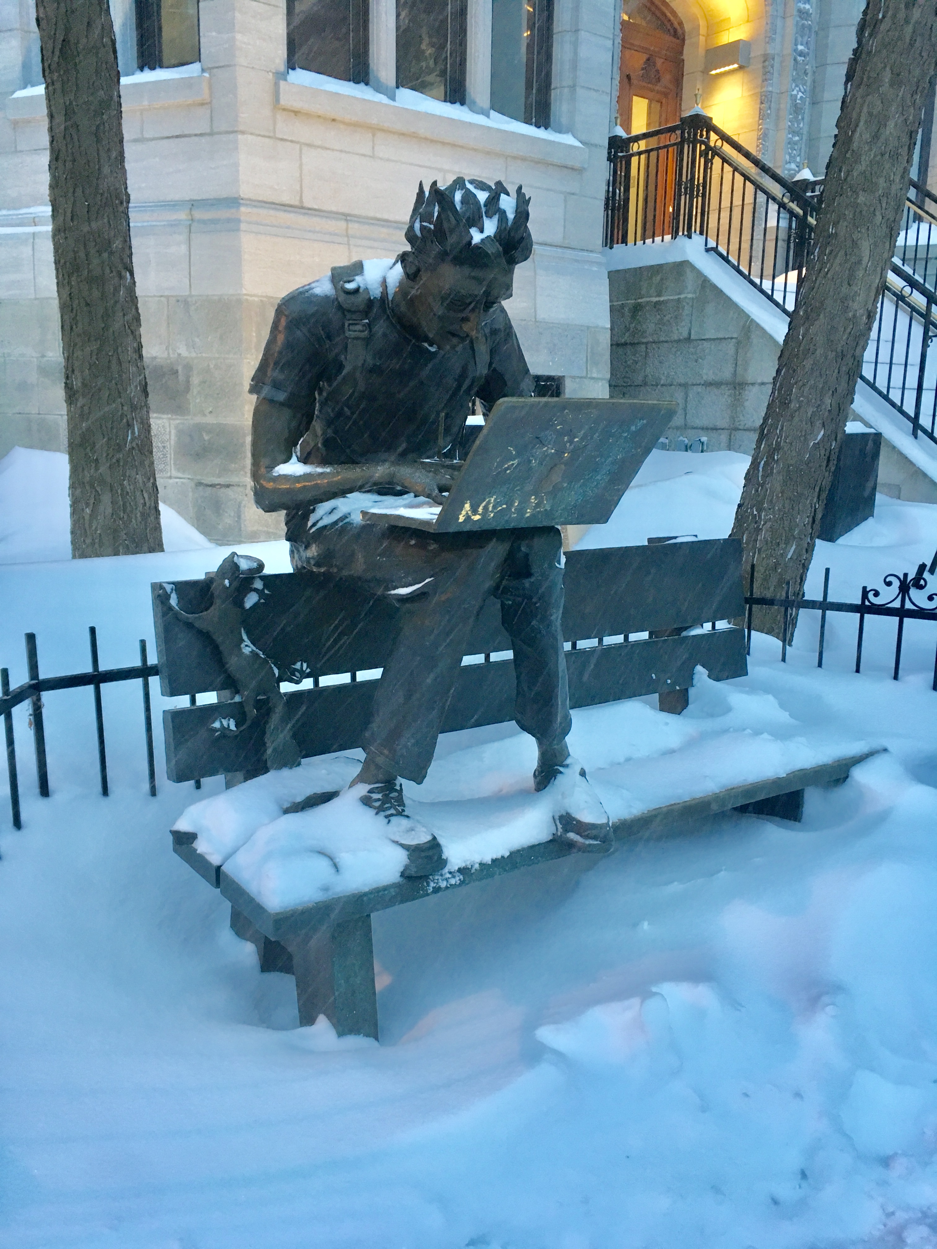 Les statuts du centre ville sont recouvertes de neige. L’art est ainsi transformé, le visuel change en fonction des saisons.