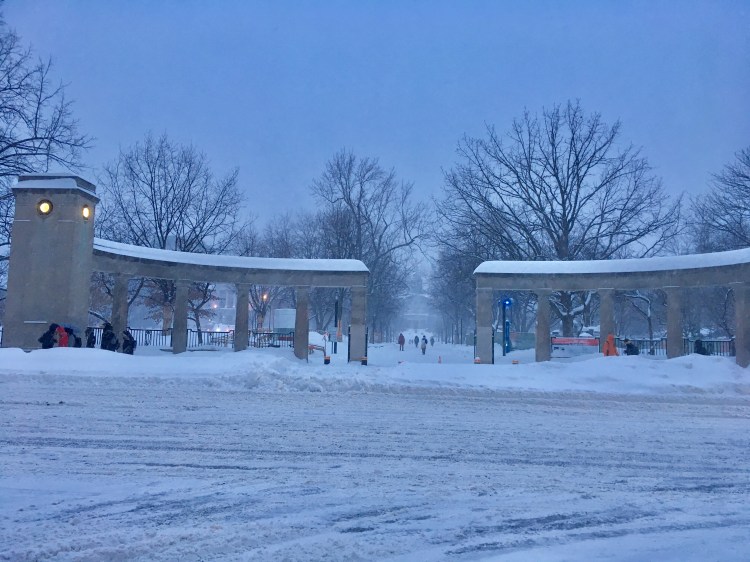 Devant l’entrée de l’université McGill au centre ville de Montréal, on n’aperçoit même plus le Mont Royal au loin avec la neige intense qui tombe!