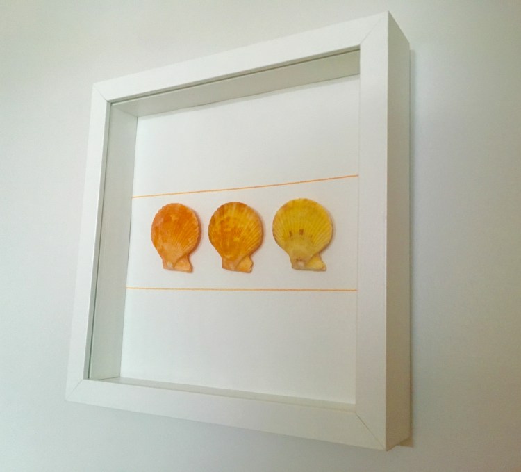 la couleur orange est une couleur bienveillante, c’est celle de la bonne humeur. Cette couleur est si vive qu’elle doit être utilisée à petite touche dans la décoration. Le jaune, l’orange et le rouge stimulent l’appétit. A l’entrée de la porte d’entrée de ma cuisine, un tableau de coquillage dans les teintes dégradées du jaune à l’orange est accroché sur le mur.