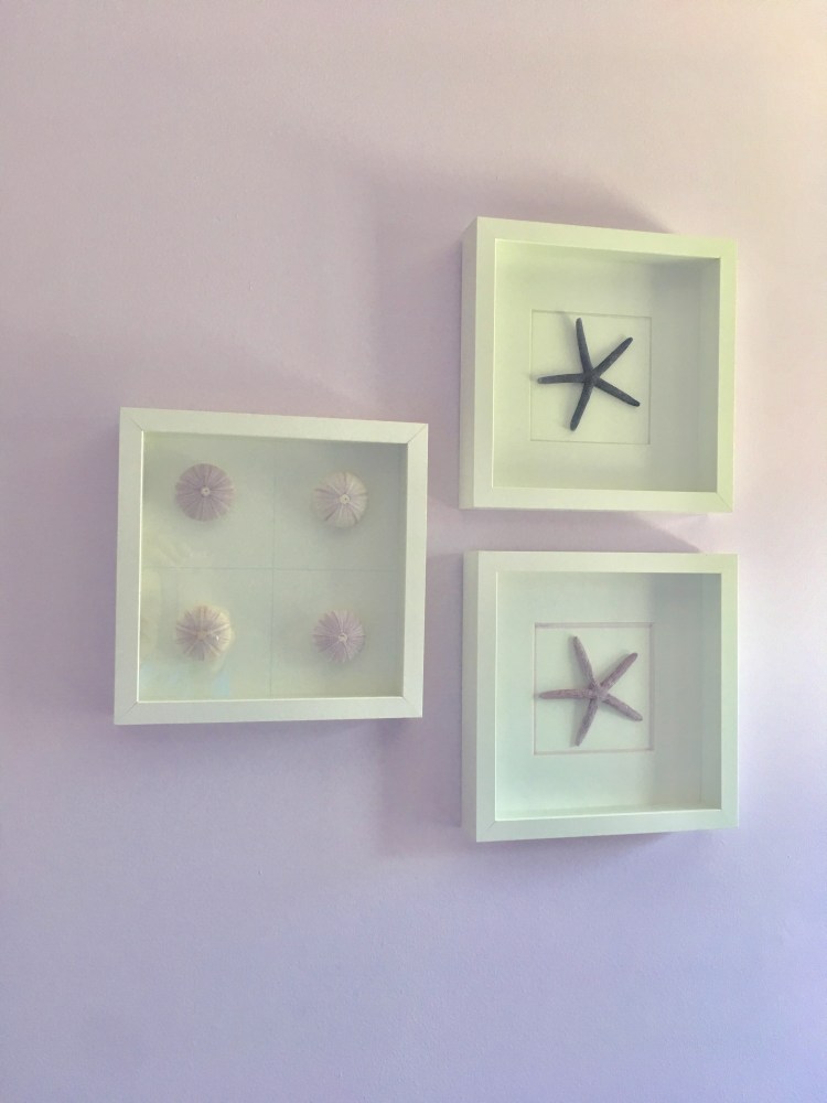 J’aime cette couleur tonique et apaisante à la fois pour ma créativité dans mon bureau dont le mur est mauve ( Nuage de Monet, 6025-21 SICO) et les rideaux violets. Les tableaux de coquillages et d’étoiles de mer ci-dessous reprennent les teintes de cette pièce.