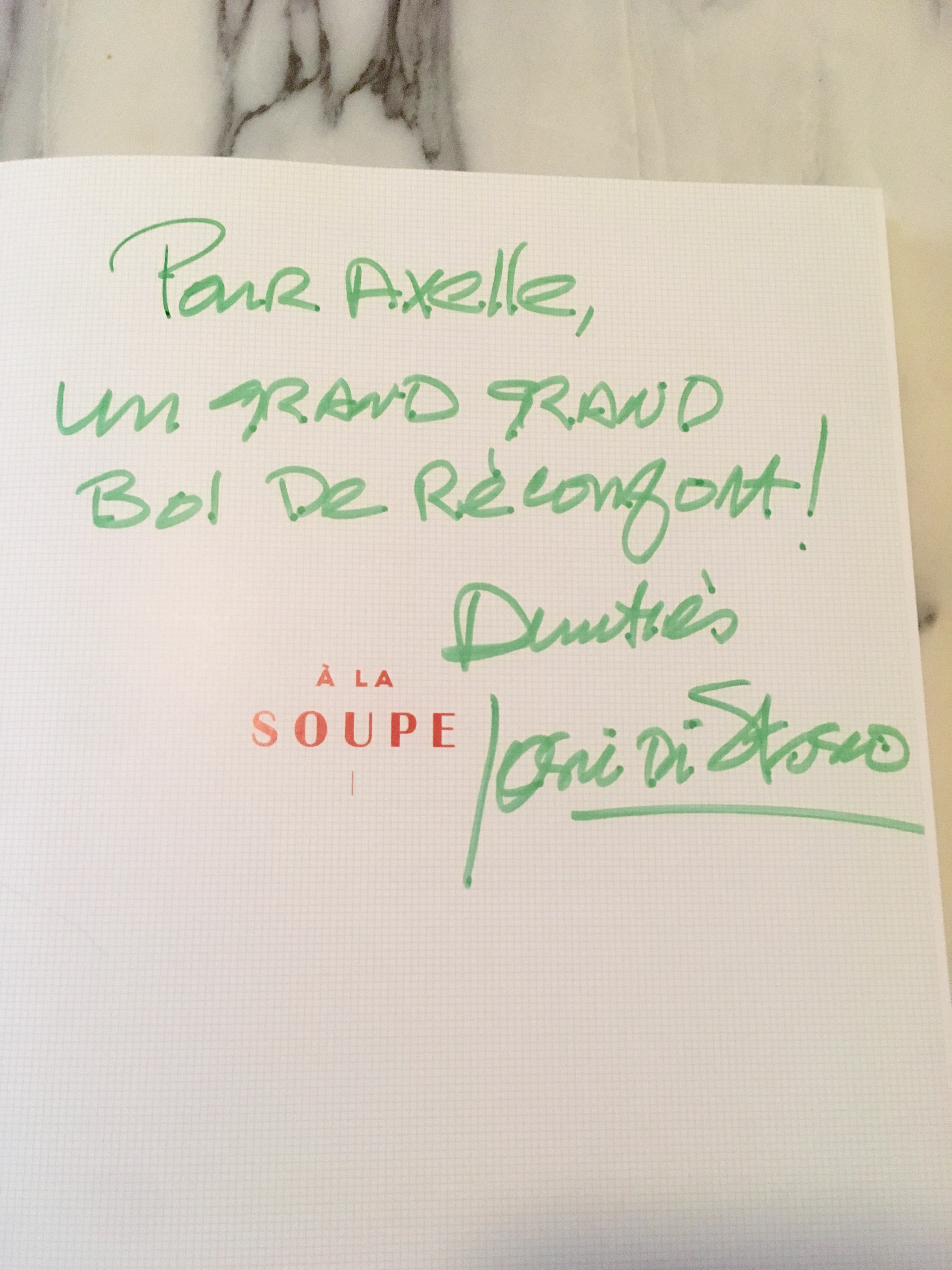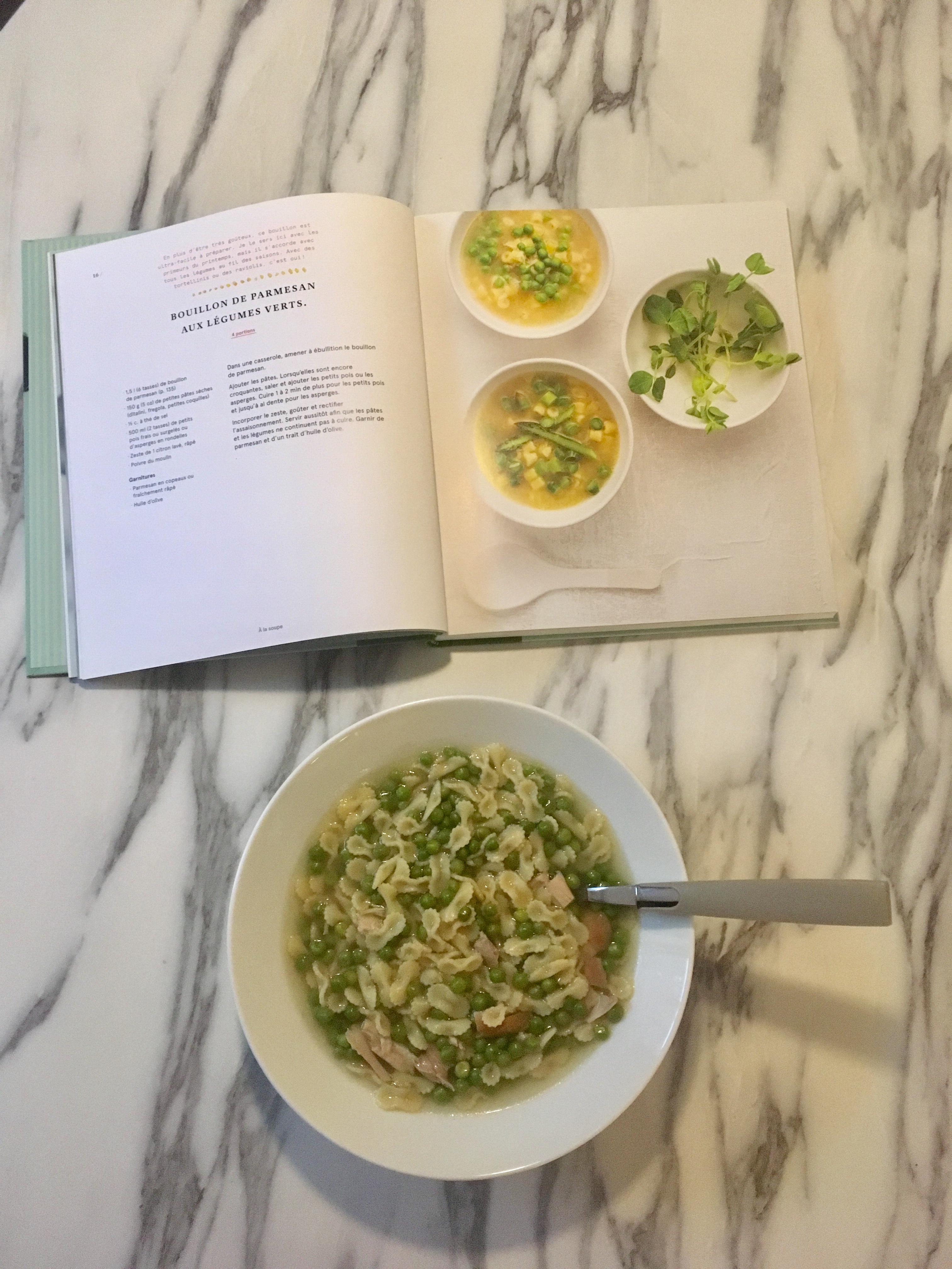 Souvenir du salon du livre de Montréal 2018, avec le confinement, je prends enfin le temps de m’inspirer du dernier livre de Josée Di Stasio «A la soupe» qu’elle m’avait dédicacée avec tellement de gentillesse et de partage de son savoir faire. Je voulais cuisiner avec des petits pois congelés. J’ai préparé un bouillon de légumes avec des feuilles de céleri qui me restait de préparations précédentes, j’y ai ajouté mes petits pois avec des petites pâtes à soupe et un restant de poulet cuit. Tellement bon!