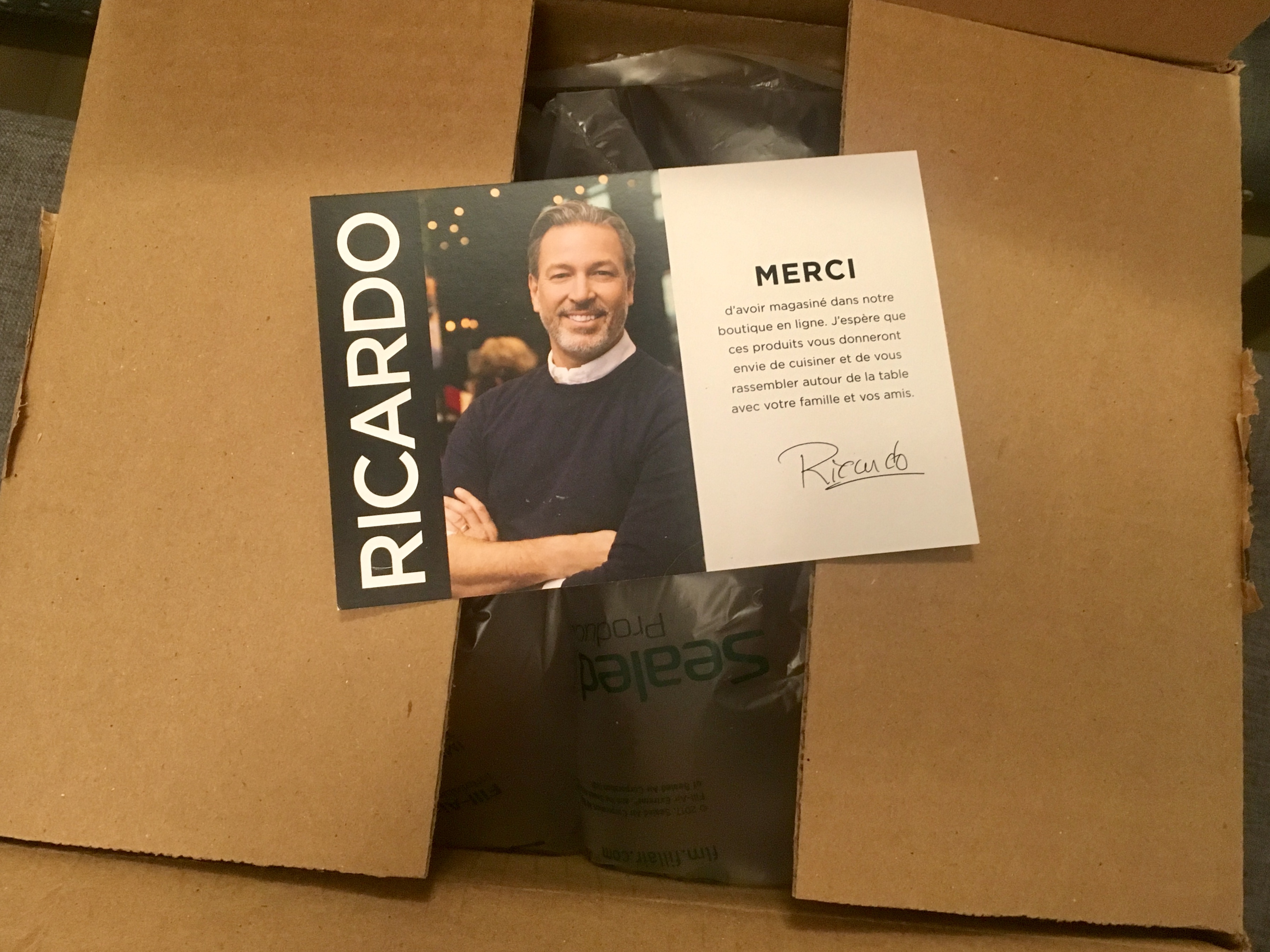 La boutique Ricardo (objets de cuisine) à la maison avec la commande en ligne et la boite devant sa porte!