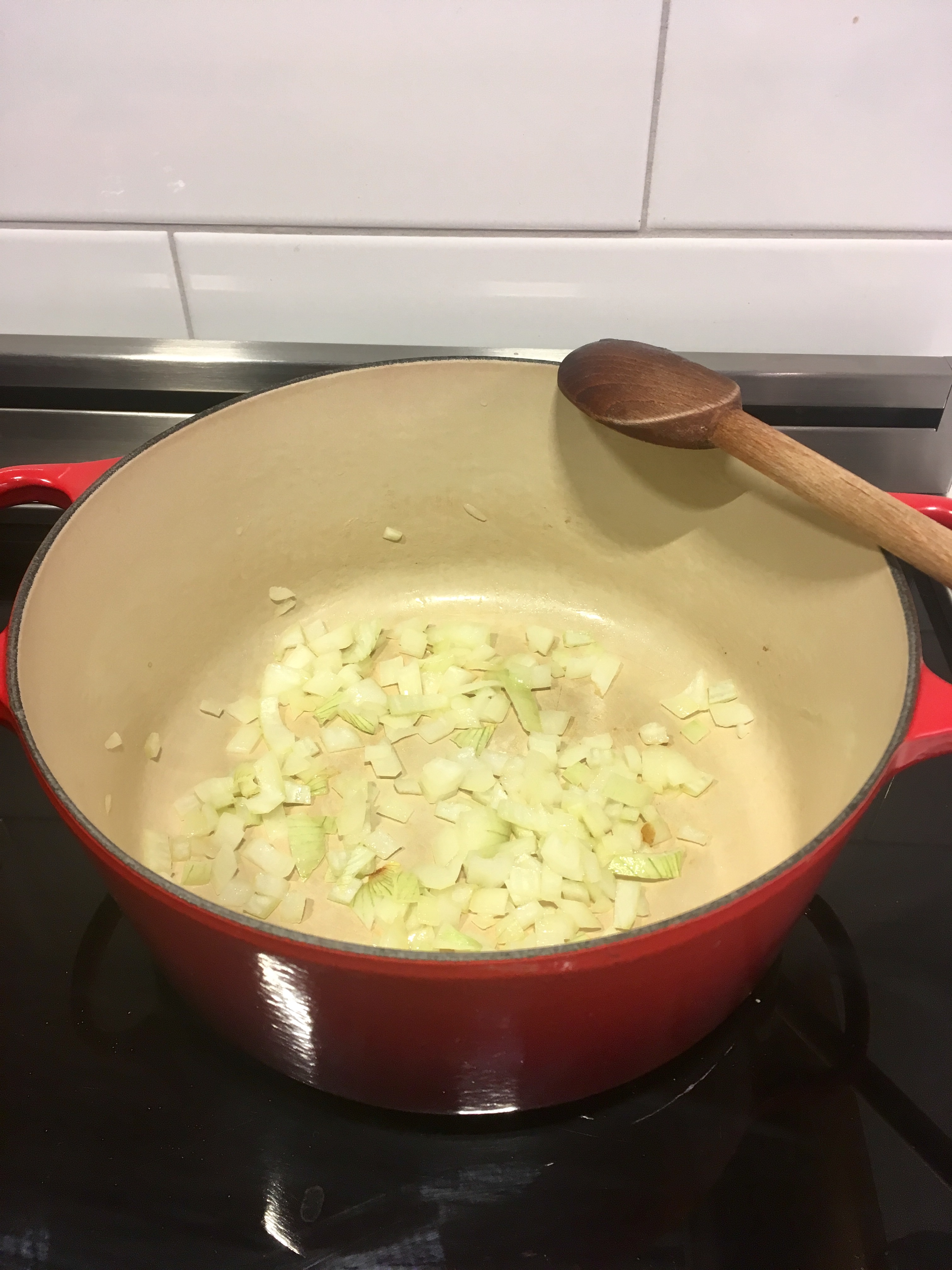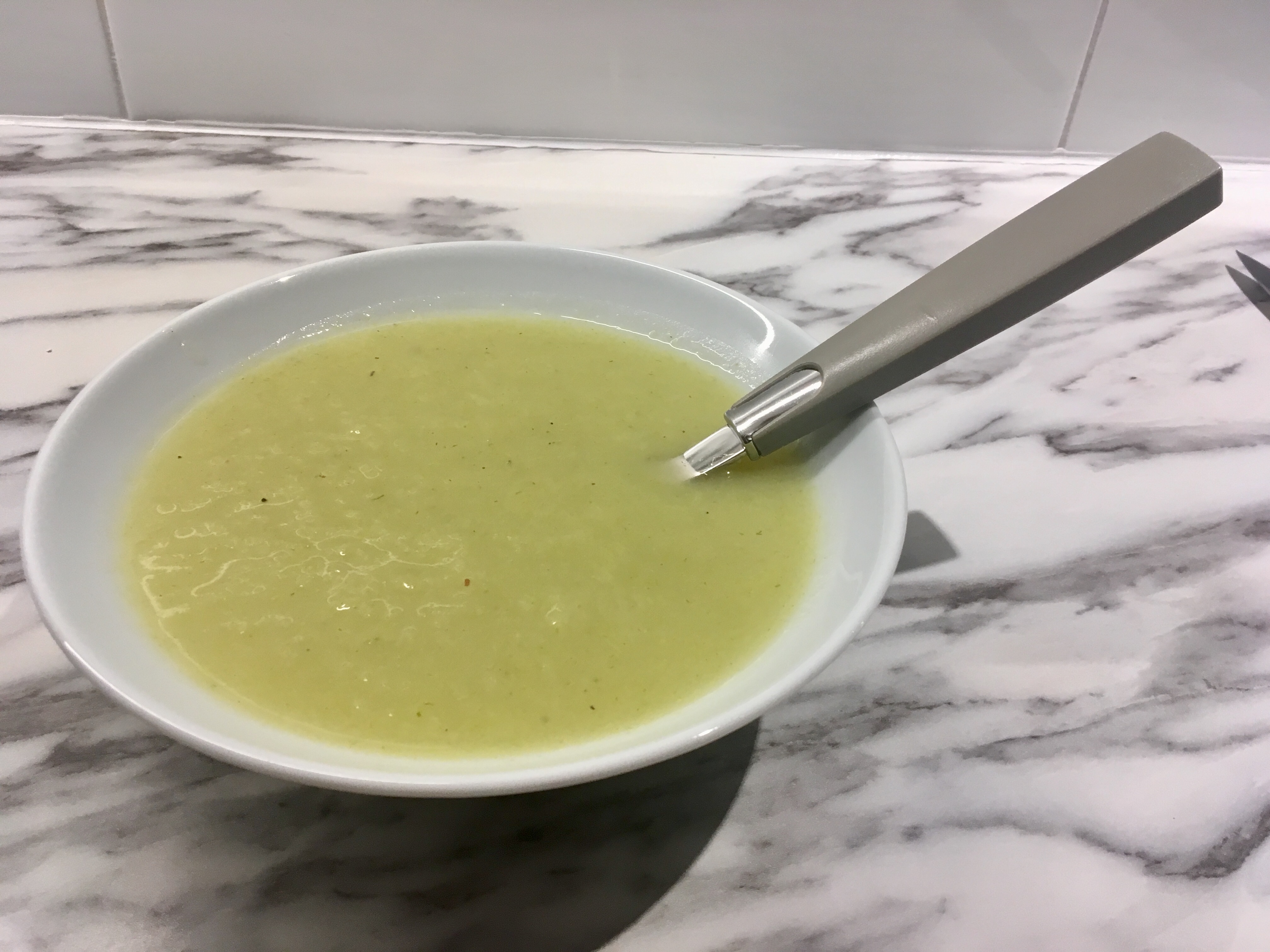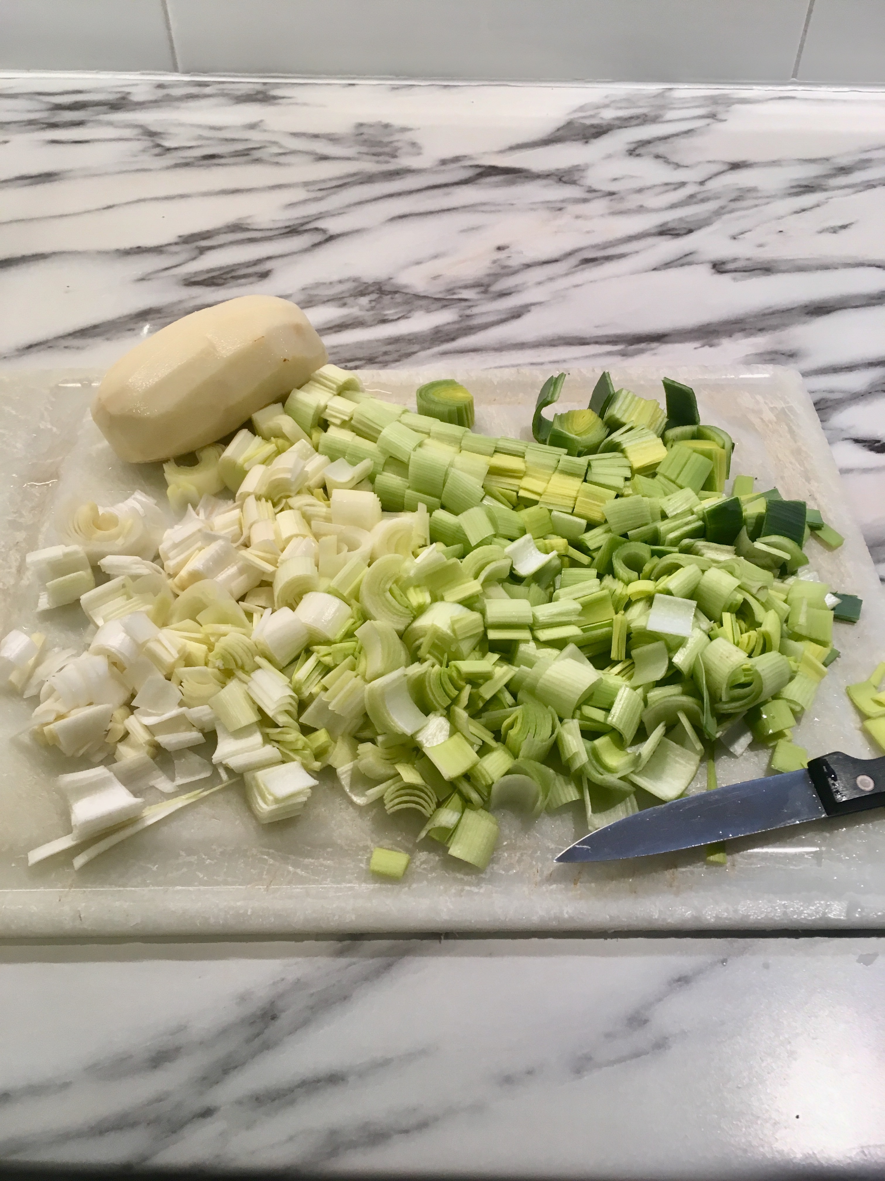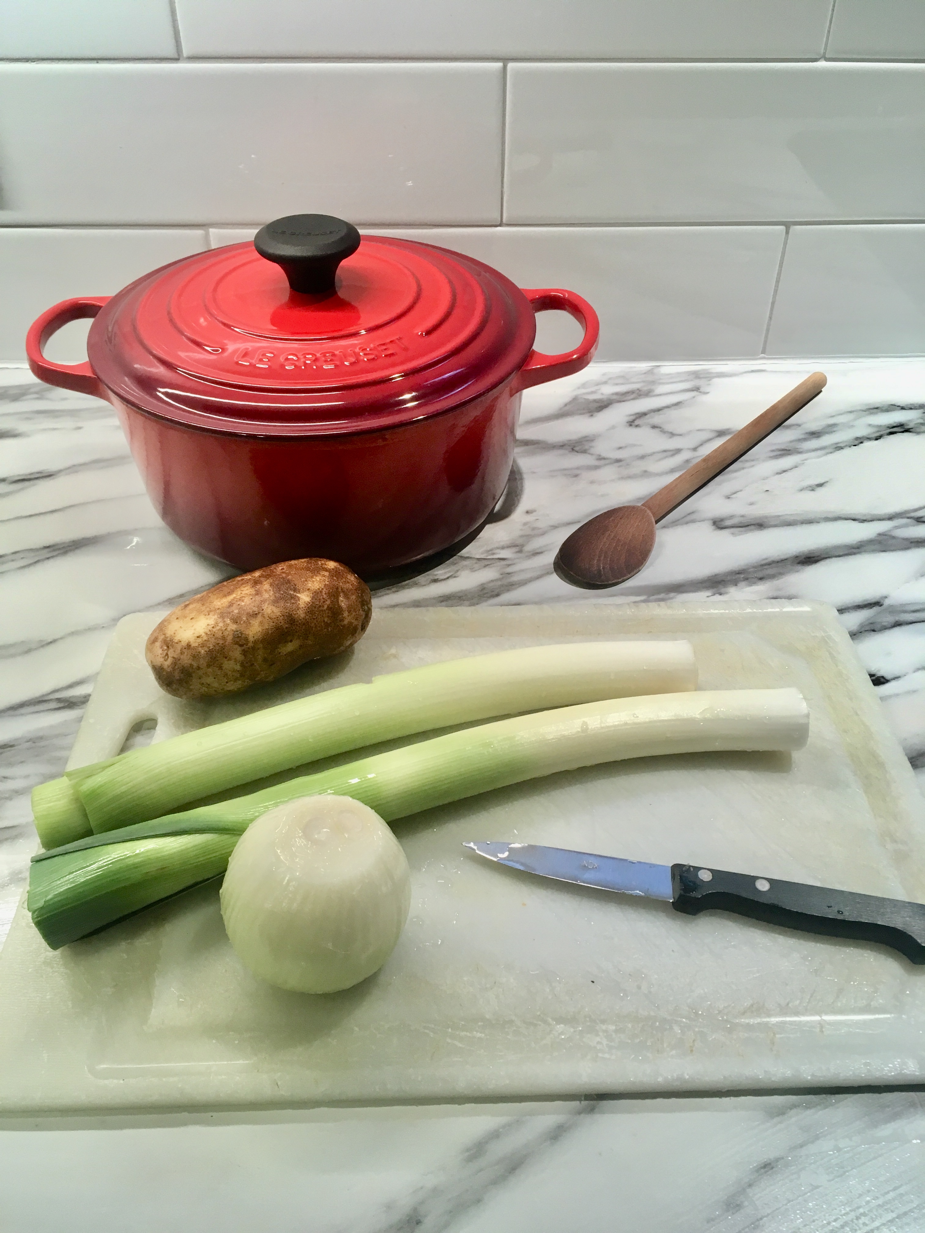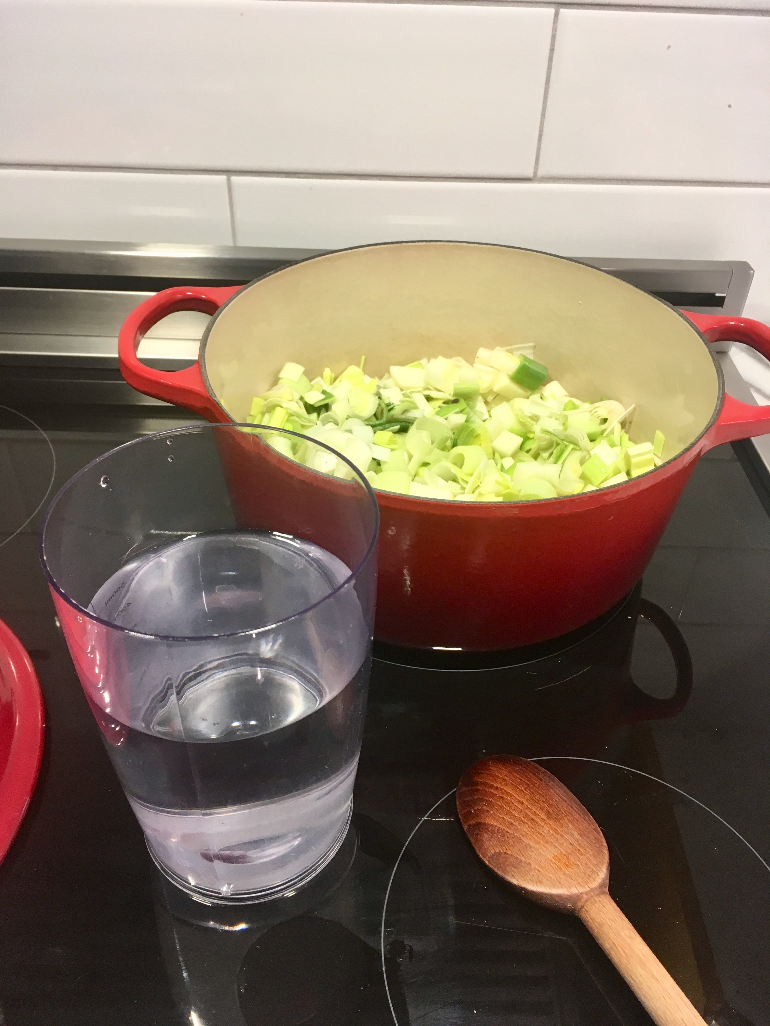 3 ingrédients seulement (1 oignon, 2 poireaux et une pomme de terre) et 15 minutes de cuisson suffisent dans une cocotte.