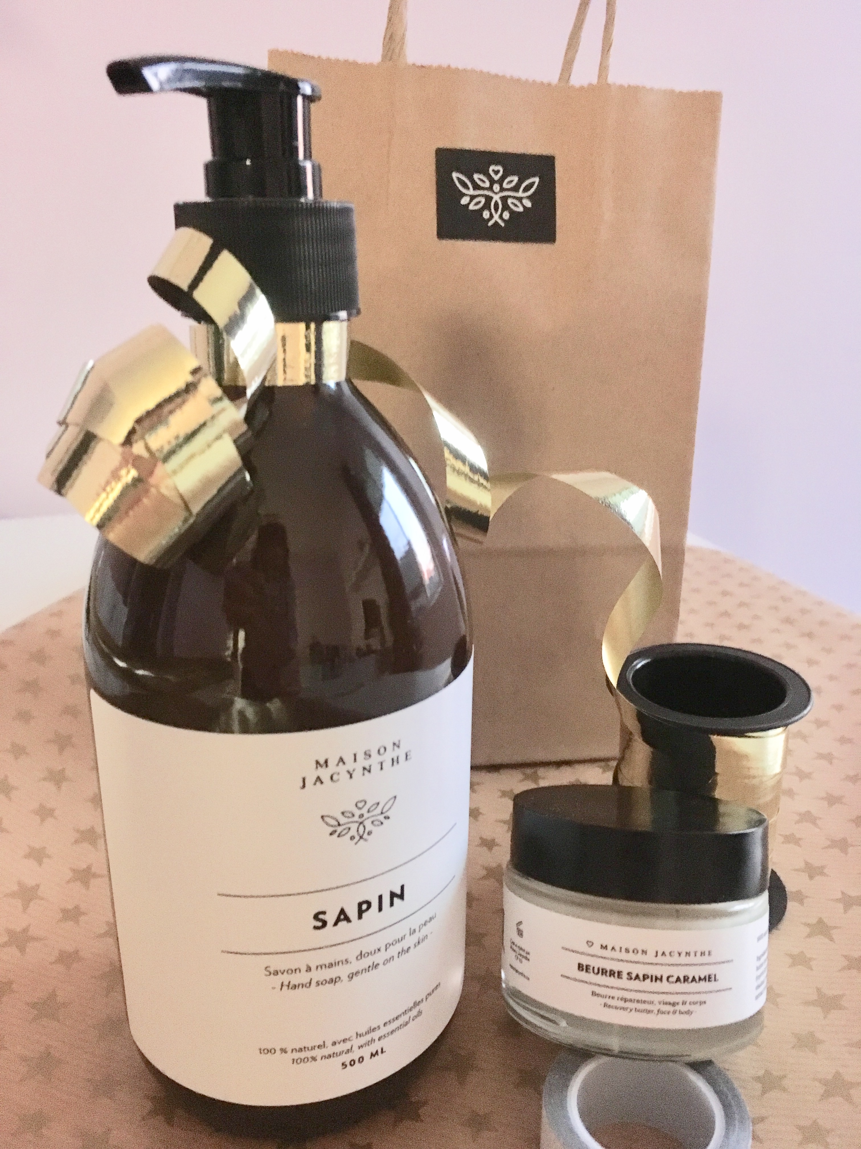 Un savon à mains, doux pour la peau avec un beurre réparateur au karité, des arômes de sapin caramel avec des huiles essentielles pures à la senteur de sapin du Québec. Ce produit est une création Maison Jacynthe. (lien ici)