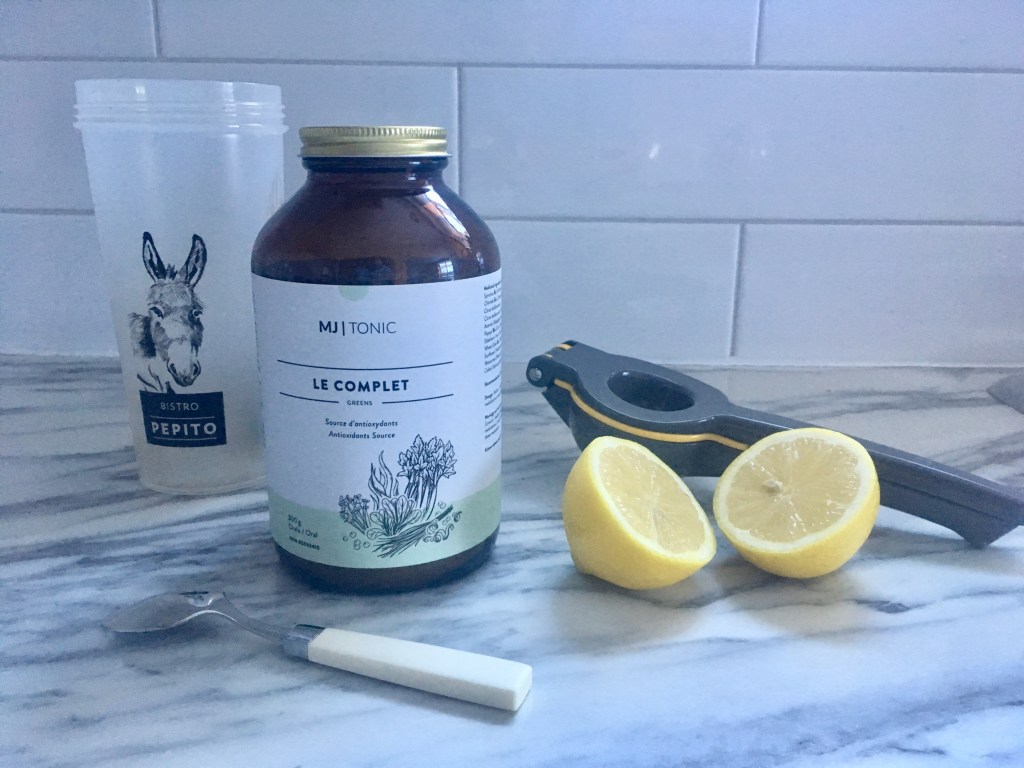 Quel goût! Quelle variété de produits! Quelle concentration de protéines végétales! J’ai senti une nouvelle énergie dans mes journées en les prenant à l’heure du lunch avant mon repas. Et avec le prix des légumes verts bio en hiver, j’ai donc remplacé mes smoothies vert (pour voir mon article de blog cliquer ici) par un verre de «complet». Je mets une cuillère à thé de ce mélange en poudre dans un peu de jus de pomme pressé naturel ou de jus d’un citron pressé selon mon envie du jour, dilué dans de l’eau. Je remue et c’est prêt à boire.