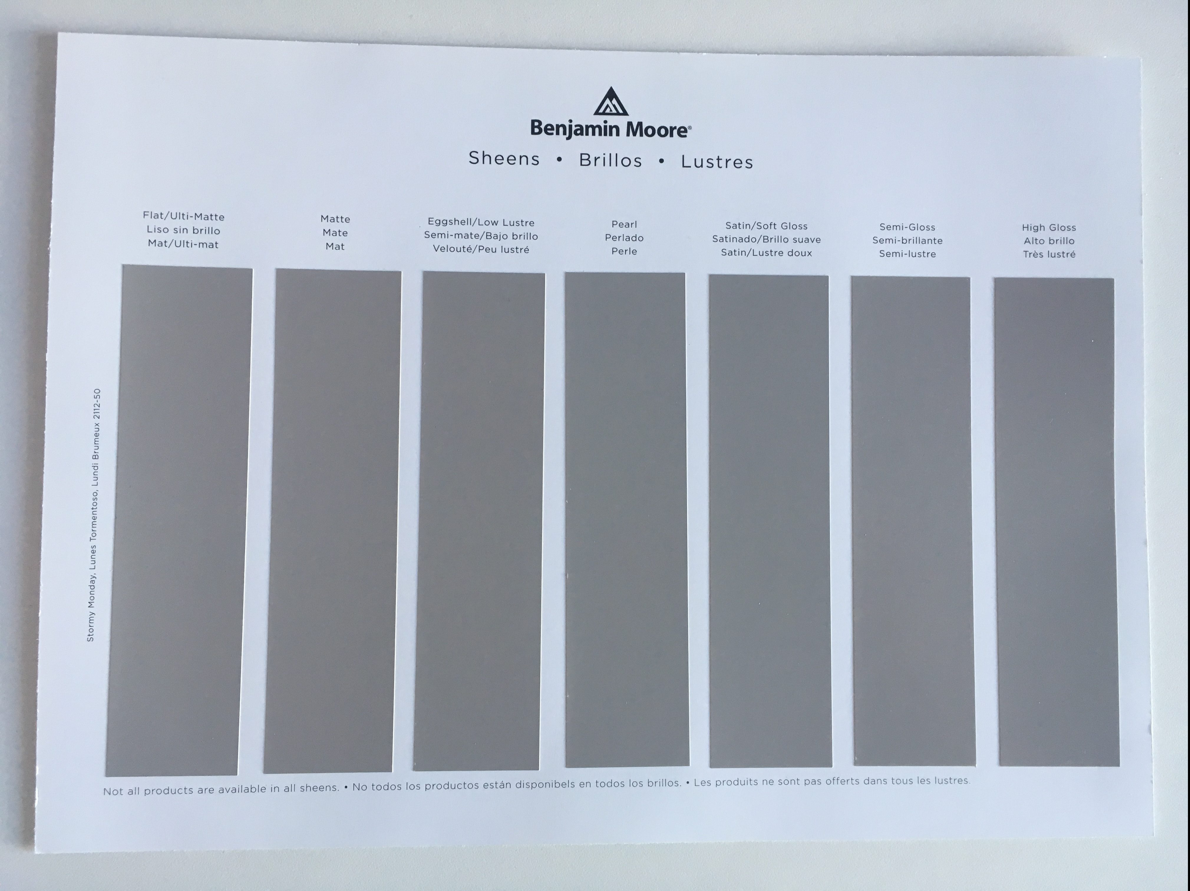 Il y a aussi une gamme de fini à s’y perdre. Voici le repère en photo que j’ai trouvé avec cette planche de couleur qui montre la différence entre le fini mat et le fini lustré en passant par le semi-lustré. Dans les peintures actuelles de mes portes et moulures, le fini était trop mat. Ce choix était plus important que j’imaginais. On apprend à chaque réalisation par «des essais-erreurs» comme on dit.