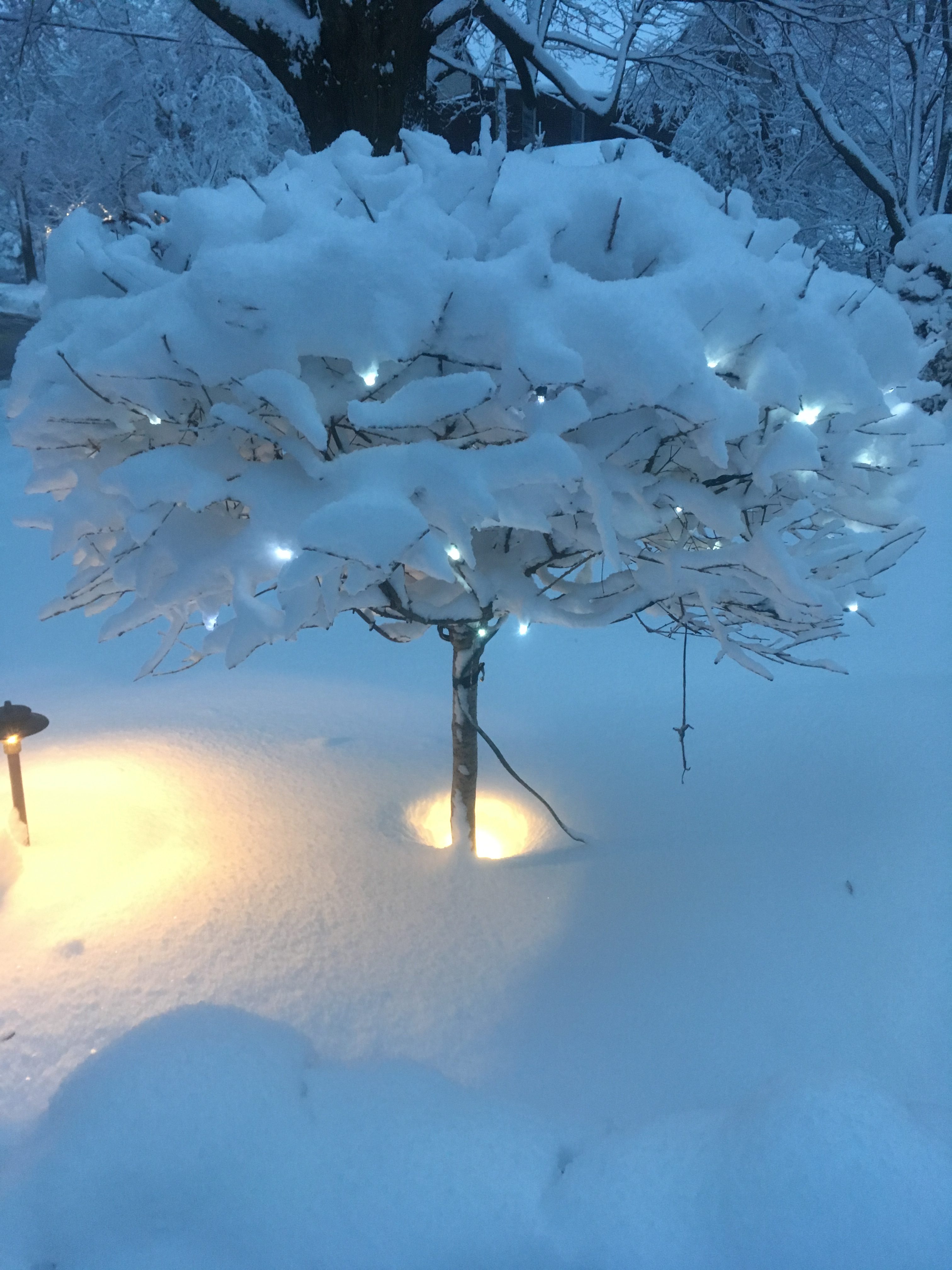 Lors d’une marche à Montréal pendant le temps des fêtes, j’ai pris cette photo qui m’inspire en me montrant comment le choix de la position des lumières révèle un décor somptueux dans le blanc immaculé de la neige!