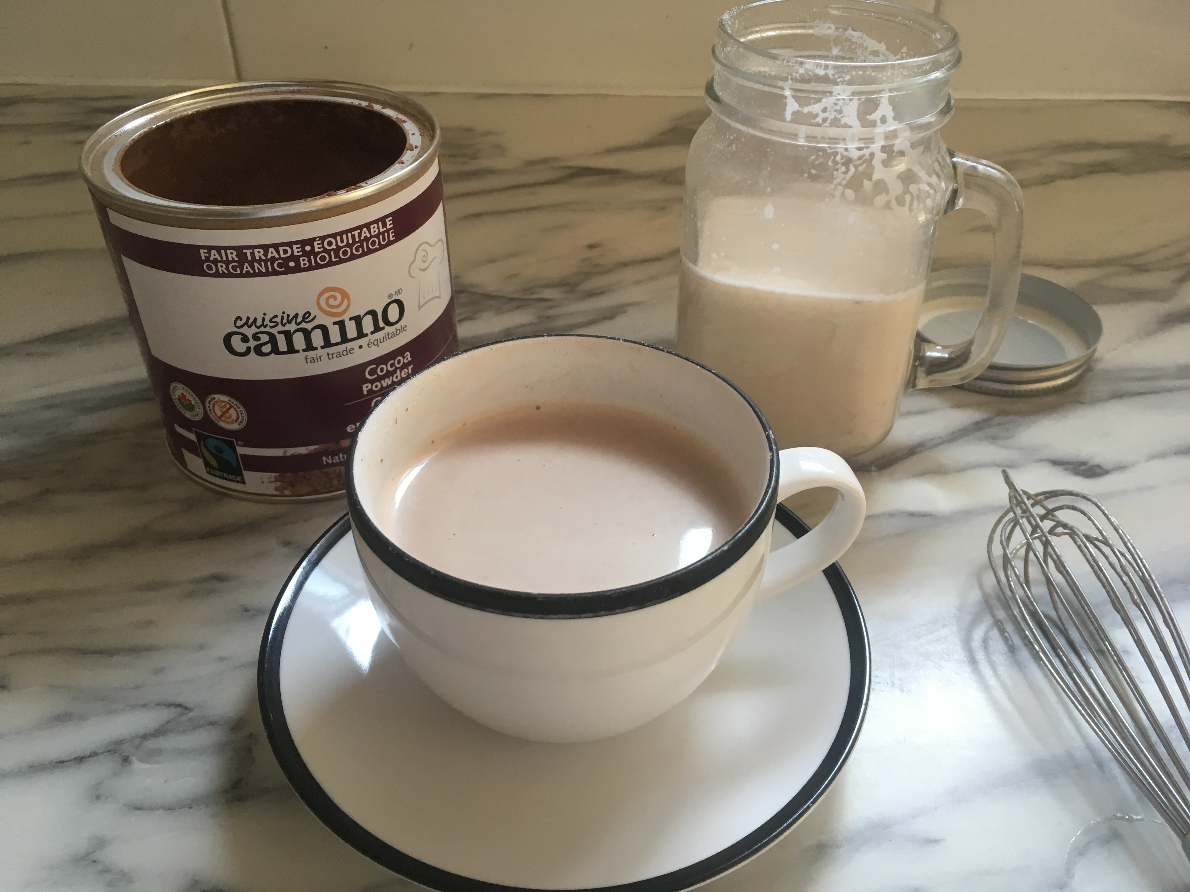 Et si on veut la version chocolatée, il suffit de faire réchauffer le lait (préparé sans vanille) avec une cuillère à thé de chocolat en poudre (ici biologique) et de fouetter la préparation. Yumi!