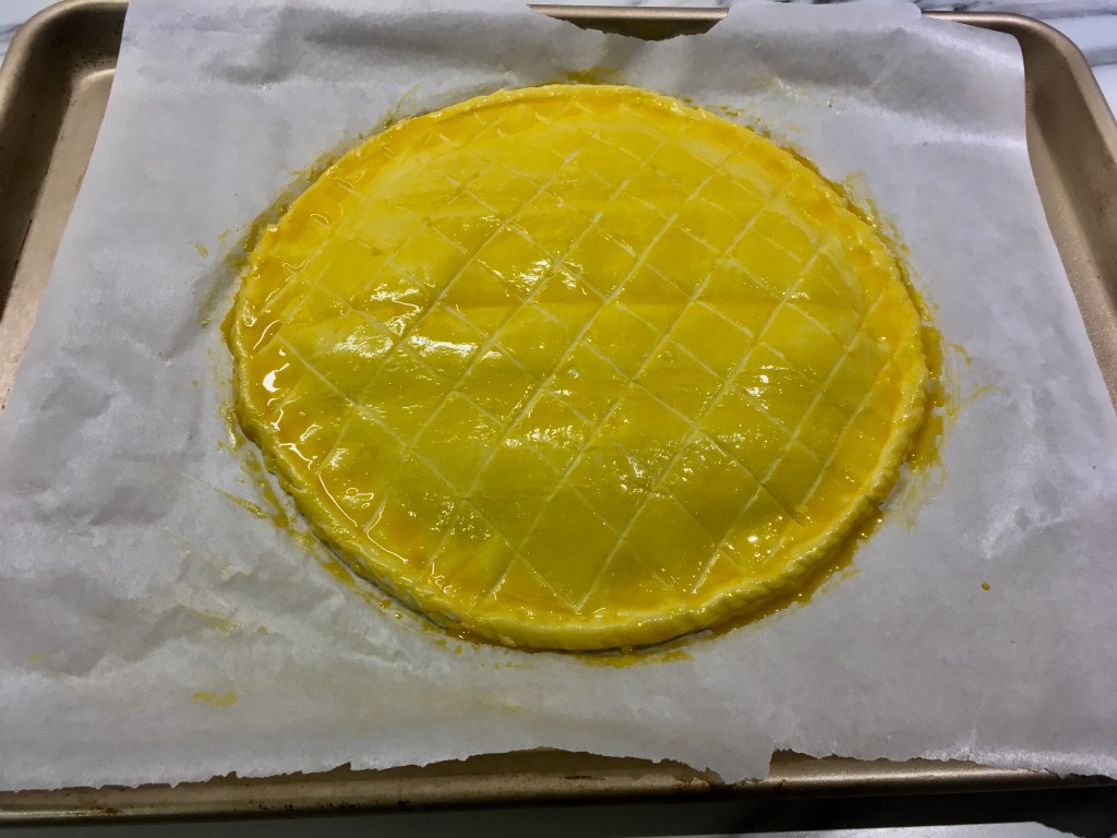 La deuxième étape est la préparation de nos 2 ronds de pâtes feuilletées pendant que la crème d’amandes est au réfrigérateur. Puis, on ajoute notre préparation dans l’intérieur du cercle marqué par le jaune d’oeuf. Enfin, on pose le deuxième rond dessus en scellant les 2 pâtes avec le jaune d’oeuf par de petites pressions du bout des doigts.
