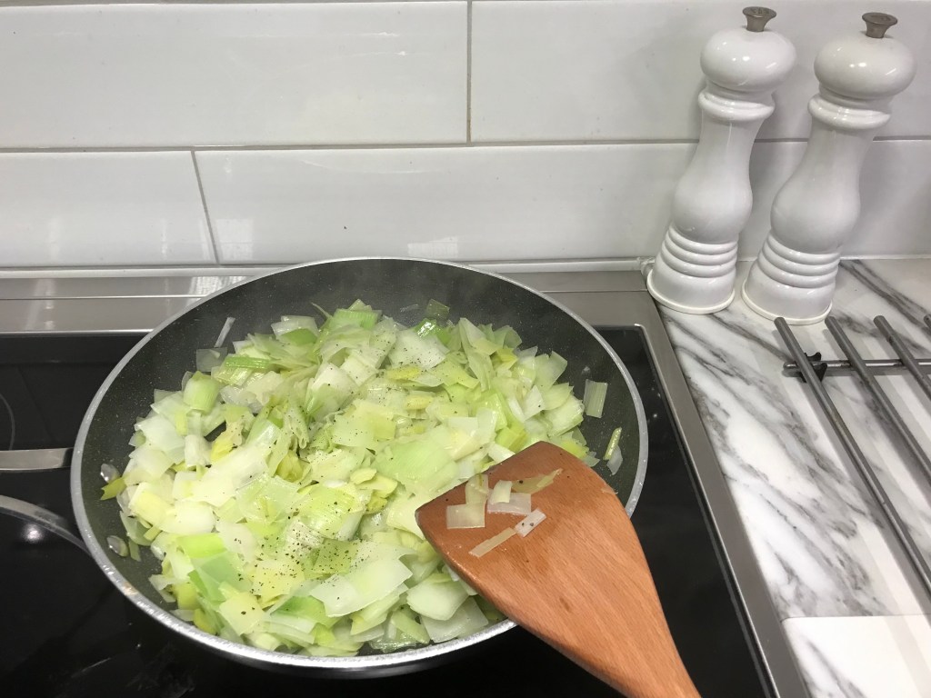 Pendant que je laisse refroidir les poireaux sur le côté, je préchauffe mon four à température moyenne 350f ou 180c.